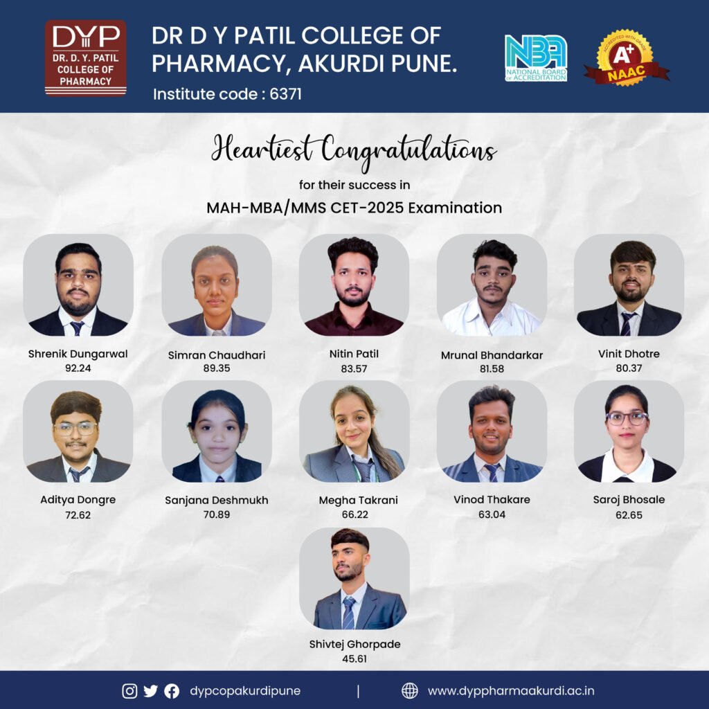 पुणे : महाराष्ट्र राज्यातील एमबीए व एमएमएस अभ्यासक्रमांच्या प्रवेशासाठी घेण्यात आलेल्या एमबीए-सीईटी २०२५ परीक्षेचा निकाल नुकताच जाहीर झाला आहे. यामध्ये आकुर्डी येथील डॉ. डी. वाय. पाटील औषधनिर्माणशास्त्र महाविद्यालयाच्या अकरा विद्यार्थ्यांनी यशस्वी कामगिरी करत महाविद्यालयाचा सन्मान वाढविला आहे.