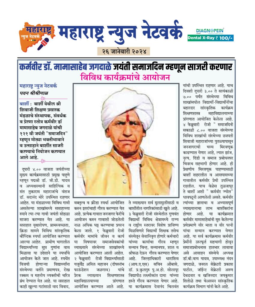 बार्शी : बार्शी येथील श्री शिवाजी शिक्षण प्रसारक मंडळाचे संस्थापक, संवर्धक व प्रेरणा स्तोत्र कर्मवीर डॉ मामासाहेब जगदाळे यांची १२१ वी जयंती “समाजदिन” म्हणून मोठ्या भक्तीभावाने व उत्साहाने बार्शीत साजरी करण्याचे नियोजन करण्यात आले आहे.
