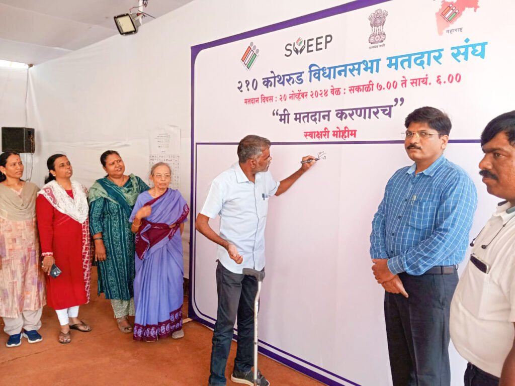 कोथरूड मतदारसंघातील के.अनुसयाबाई खिलारे मॉडेल स्कूल, एरंडवणे, पुणे येथील कार्यालयात स्वीप मोहिमेच्या अंतर्गत स्वाक्षरी मोहिमेची सुरुवात ज्येष्ठ नागरिक विद्या खरे (वय 80 वर्षे) यांच्या हस्ते करण्यात आली. यावेळी दिव्यांग कर्मचारी देखील उपस्थित होते.