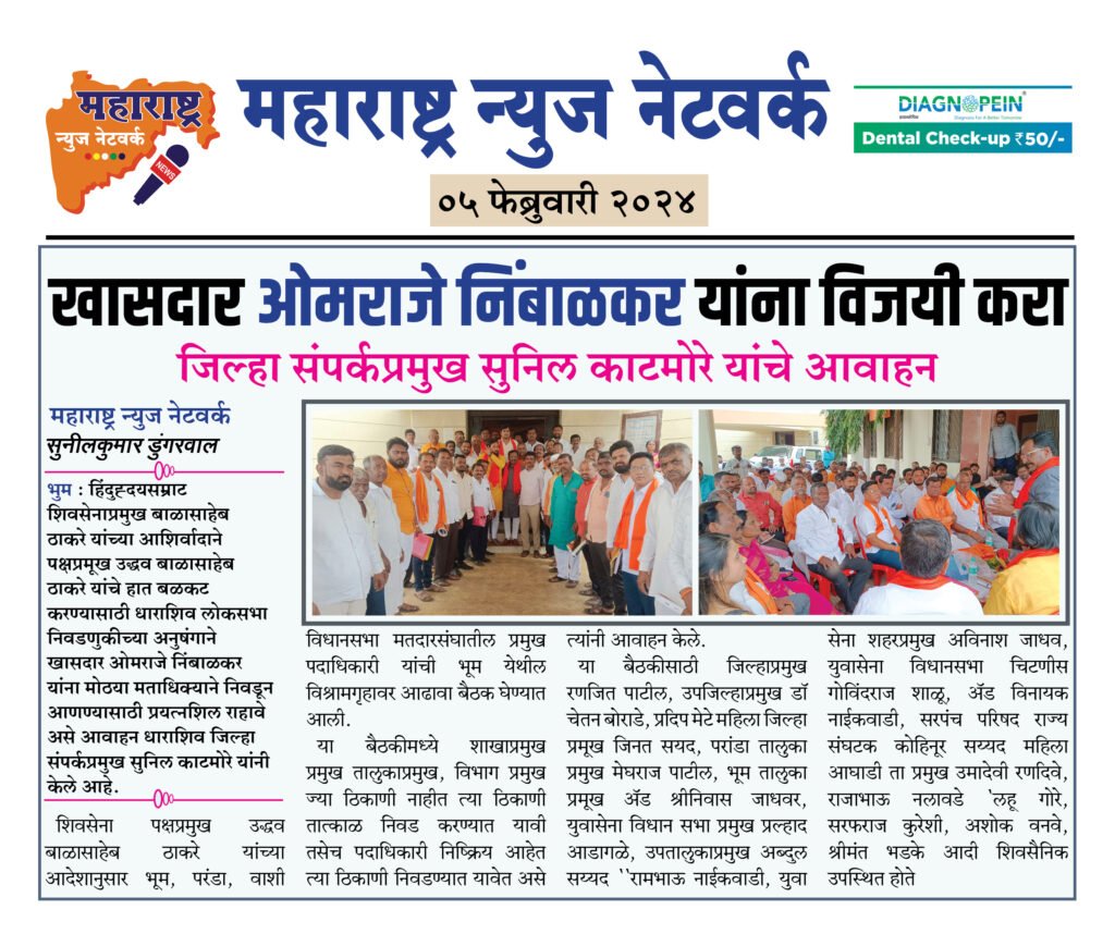 भुम : हिंदुह्दयसम्राट शिवसेनाप्रमुख बाळासाहेब ठाकरे यांच्या आशिर्वादाने पक्षप्रमूख उद्धव बाळासाहेब ठाकरे यांचे हात बळकट करण्यासाठी धाराशिव लोकसभा निवडणुकीच्या अनुषंगाने खासदार ओमराजे निंबाळकर यांना मोठया मताधिक्याने निवडून आणण्यासाठी प्रयत्नशिल राहावे असे आवाहन धाराशिव जिल्हा संपर्कप्रमुख सुनिल काटमोरे यांनी केले आहे शिवसेना पक्षप्रमुख उद्धव बाळासाहेब ठाकरे यांच्या आदेशानुसार भूम, परंडा, वाशी विधानसभा मतदारसंघातील प्रमुख पदाधिकारी यांची भूम येथील विश्रामगृहावर आढावा बैठक घेण्यात आली. या बैठकीमध्ये शाखाप्रमुख प्रमुख तालुकाप्रमुख, विभाग प्रमुख ज्या ठिकाणी नाहीत त्या ठिकाणी तात्काळ निवड करण्यात यावी तसेच पदाधिकारी निष्क्रिय आहेत त्या ठिकाणी निवडण्यात यावेत असे त्यांनी आवाहन केले. या बैठकीसाठी जिल्हाप्रमुख रणजित पाटील, उपजिल्हाप्रमुख डॉ चेतन बोराडे, प्रदिप मेटे महिला जिल्हा प्रमूख जिनत सयद, परांडा तालुका प्रमुख मेघराज पाटील, भूम तालुका प्रमूख ॲड श्रीनिवास जाधवर, युवासेना विधान सभा प्रमुख प्रल्हाद आडागळे, उपतालुकाप्रमुख अब्दुल सय्यद ”रामभाऊ नाईकवाडी, युवा सेना शहरप्रमुख अविनाश जाधव, युवासेना विधानसभा चिटणीस गोविंदराज शाळू, ॲड विनायक नाईकवाडी, सरपंच परिषद राज्य संघटक कोहिनूर सय्यद महिला आघाडी ता प्रमुख उमादेवी रणदिवे, राजाभाऊ नलावडे, लहू गोरे, सरफराज कुरेशी, अशोक वनवे, श्रीमंत भडके आदी शिवसैनिक उपस्थित होते.