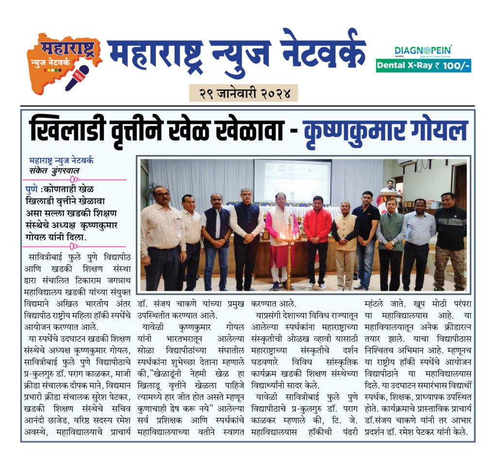 सावित्रीबाई फुले पुणे विद्यापीठ आणि खडकी शिक्षण संस्था द्वारा संचालित टिकाराम जगन्नाथ महाविद्यालय खडकी यांच्या संयुक्त विद्यमाने अखिल भारतीय अंतर विद्यापीठ राष्ट्रीय महिला हॉकी स्पर्धेचे आयोजन करण्यात आले.