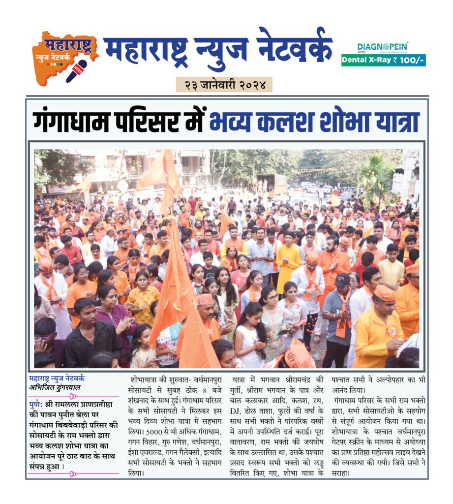 पुणे: श्री रामलला प्राणप्रतीष्ठा की पावन पुनीत बेला पर गंगाधाम बिबवेवाड़ी परिसर की सोसायटी के राम भक्तो द्वारा भव्य कलश शोभा यात्रा का आयोजन पूरे ठाट बाट के साथ संपन्न हुआ ।
