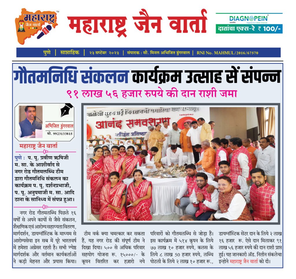 ← Back to Homepage गौतमनिधि संकलन कार्यक्रम उत्साह से संपन्न maharashtrajainwarta • Maharashtra Jain Warta, MJW Daily News(Post Slider) • November 16, 2023 📥 Download News PDF