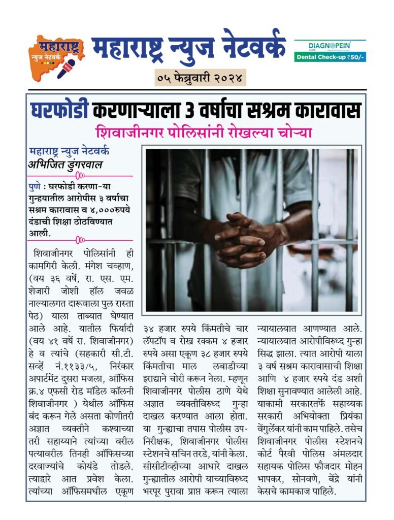 शिवाजीनगर पोलिसांनी ही कामगिरी केली. मंगेश चव्हाण, (वय ३६ वर्षे, रा. एस. एम. शेजारी जोशी हॉल जवळ नाल्यालगत दारूवाला पुल रास्ता पेठ) याला ताब्यात घेण्यात आले आहे. यातील फिर्यादी (वय ४१ वर्षे रा. शिवाजीनगर) हे व त्यांचे (सहकारी सी.टी.सर्व्हे नं.११३३/५, निरंकार अपार्टमेंट दुसरा मजला, ऑफिस क्र.४ एफसी रोड मॉडेल कॉलनी शिवाजीनगर ) येथील ऑफिस बंद करून गेले असता कोणीतरी अज्ञात व्यक्तीने कश्याच्या तरी सहाय्याने त्यांच्या वरील पत्यावरील तिनही ऑफिसच्या दरवाज्यांचे कोयंडे तोडले. त्याद्वारे आत प्रवेश केला. त्यांच्या ऑफिसमधील एकूण ३४ हजार रुपये किंमतीचे चार लॅपटॉप व रोख रक्कम ४ हजार रुपये असा एकूण ३८ हजार रुपये किंमतीचा माल लबाडीच्या इराद्याने चोरी करून नेला. म्हणून शिवाजीनगर पोलीस ठाणे येथे अज्ञात व्यक्तीविरुध्द गुन्हा दाखल करण्यात आला होता. या गुन्ह्याचा तपास पोलीस उप-निरीक्षक, शिवाजीनगर पोलीस स्टेशनचे सचिन तरडे, यांनी केला. सीसीटीव्हीच्या आधारे दाखल गुन्ह्यातील आरोपी याच्याविरुध्द भरपूर पुरावा प्राप्त करून त्याला न्यायालयात आणण्यात आले. न्यायालयात आरोपीविरुध्द गुन्हा सिद्ध झाला. त्यात आरोपी याला ३ वर्ष सश्रम कारावासाची शिक्षा आणि ४ हजार रुपये दंड अशी शिक्षा सुनावण्यात आलेली आहे. याकामी सरकारतर्फे सहाय्यक सरकारी अभियोक्ता प्रियंका वेंगुर्लेकर यांनी काम पाहिले. तसेच शिवाजीनगर पोलीस स्टेशनचे कोर्ट पैरवी पोलिस अंमलदार सहायक पोलिस फौजदार मोहन भापकर, सोनवणे, बेंद्रे यांनी केसचे कामकाज पाहिले.