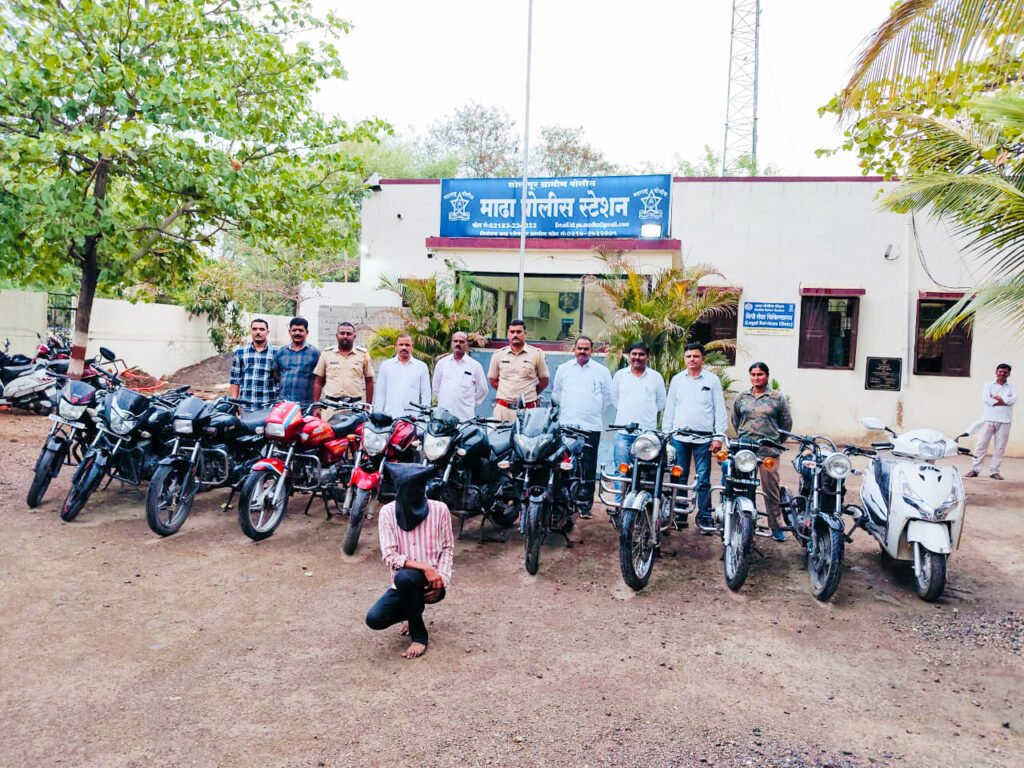 चोरीच्या गुन्हयातील चोरीस गेलेल्या एकूण ११ मोटारसायकली ताब्यात घेऊन ८ लाख ६५ हजार रूपये हस्तगत करण्यात माढा पोलिसांना यश आले आहे. या प्रकरणी उपळाई खु येथील सुहास रमेश कदम (वय २२) याला अटक करण्यात आली आहे.