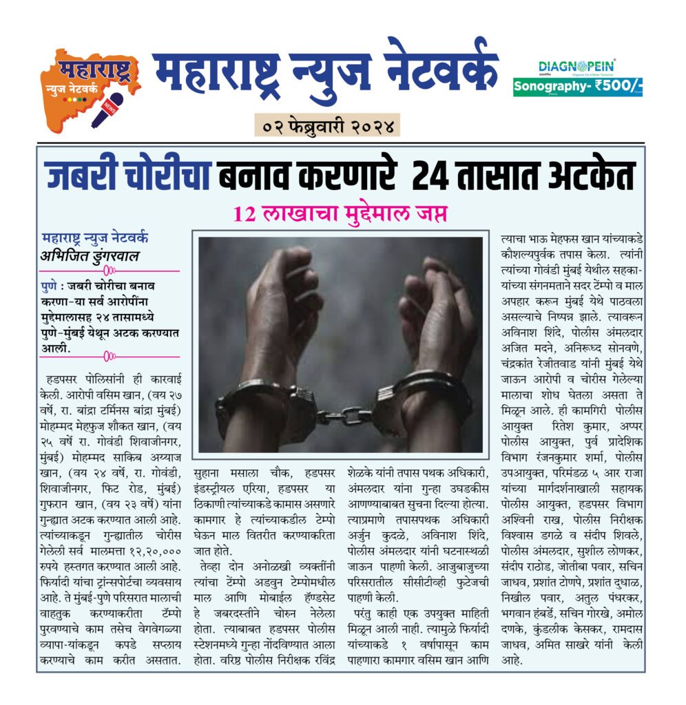 हडपसर पोलिसांनी ही कारवाई केली. आरोपी वसिम खान, (वय २७ वर्षे, रा. बांद्रा टर्मिनस बांद्रा मुंबई) मोहम्मद मेहफुज शौकत खान, (वय २५ वर्षे रा. गोवंडी शिवाजीनगर, मुंबई) मोहम्मद साकिब अय्याज खान, (वय २४ वर्षे, रा. गोवंडी, शिवाजीनगर, फिट रोड, मुंबई) गुफरान खान, (वय २३ वर्षे) यांना गुन्ह्यात अटक करण्यात आली आहे. त्यांच्याकडून गुन्ह्यातील चोरीस गेलेली सर्व मालमत्ता १२,२०,००० रुपये हस्तगत करण्यात आली आहे. फिर्यादी यांचा ट्रांन्सपोर्टचा व्यवसाय आहे. ते मुंबई-पुणे परिसरात मालाची वाहतुक करण्याकरीता टॅम्पो पुरवण्याचे काम तसेच वेगवेगळ्या व्यापा-यांकडून कपडे सप्लाय करण्याचे काम करीत असतात. सुहाना मसाला चौक, हडपसर इंडस्ट्रीयल एरिया, हडपसर या ठिकाणी त्यांच्याकडे कामास असणारे कामगार हे त्यांच्याकडील टेम्पो घेऊन माल वितरीत करण्याकरिता जात होते.
