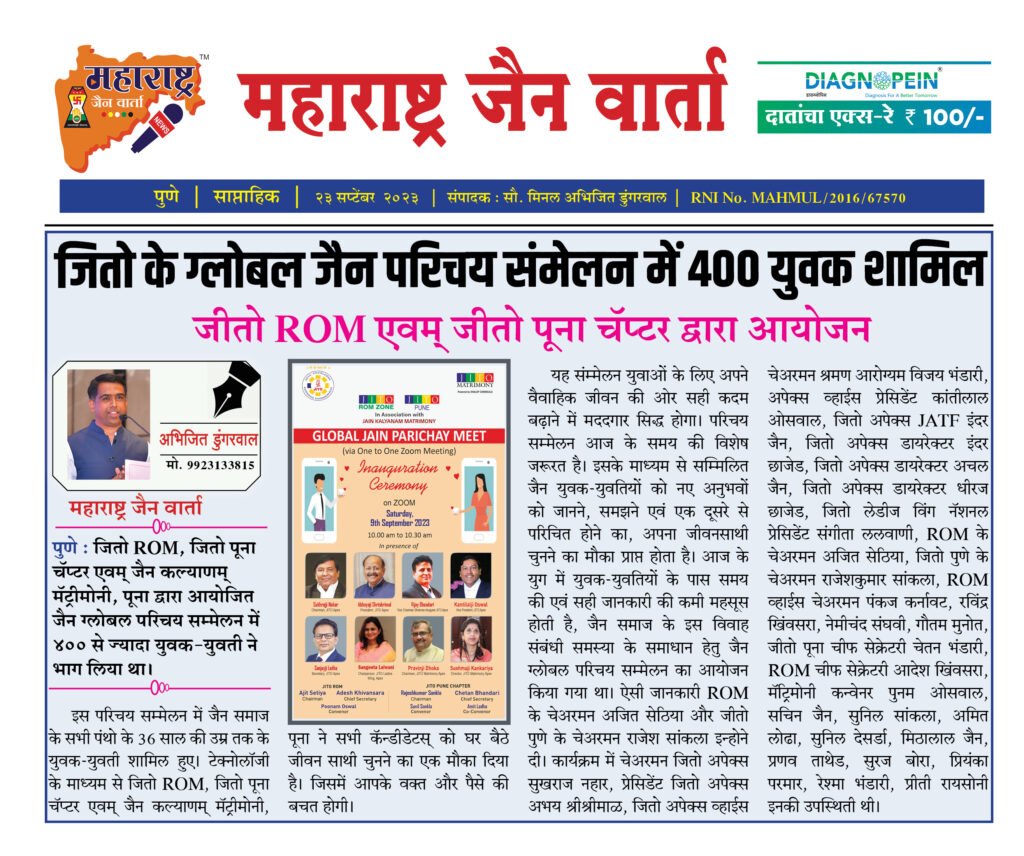 ← Back to Homepage जितो के ग्लोबल जैन परिचय संमेलन में 400 युवक शामिल जीतो ROM एवम् जीतो पूना चॅप्टर द्वारा आयोजन maharashtrajainwarta • Maharashtra Jain Warta, MJW Daily News(Post Slider) • November 16, 2023 📥 Download News PDF