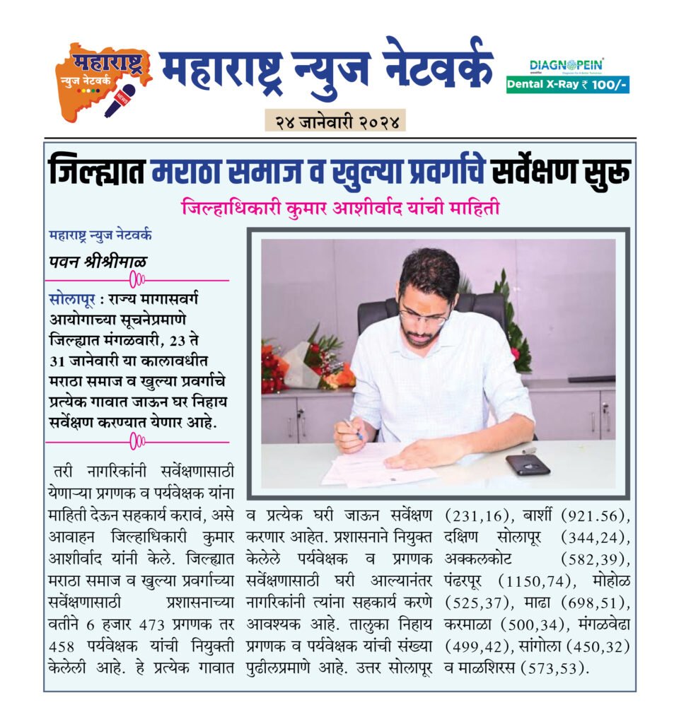 सोलापूर : राज्य मागासवर्ग आयोगाच्या सूचनेप्रमाणे जिल्ह्यात मंगळवारी, 23 ते 31 जानेवारी या कालावधीत मराठा समाज व खुल्या प्रवर्गाचे प्रत्येक गावात जाऊन घर निहाय सर्वेक्षण करण्यात येणार आहे.