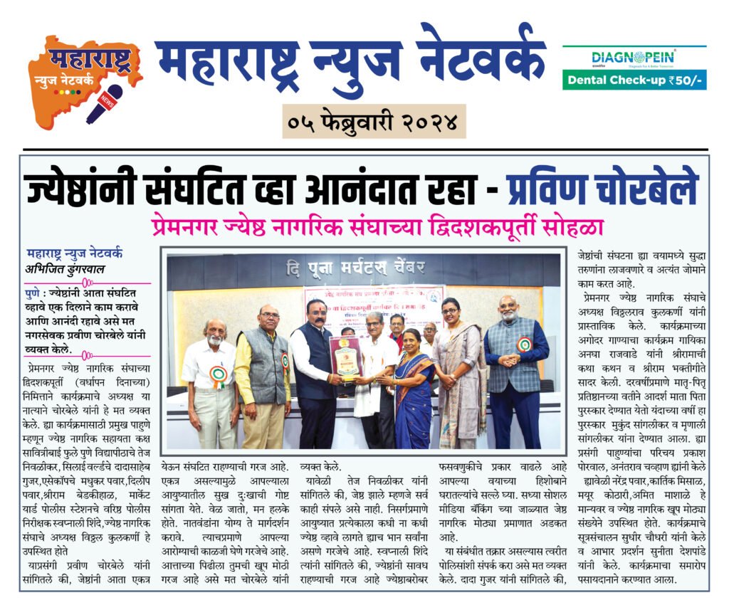 प्रेमनगर ज्येष्ठ नागरिक संघाच्या द्विदशकपूर्ती सोहळा