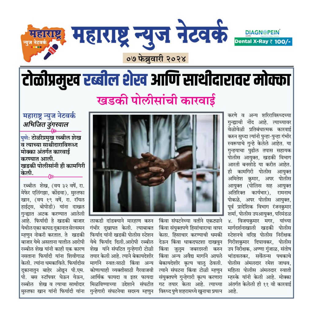 रब्बील शेख, (वय ३२ वर्षे, रा. मेफेर एलिंगझा, कोंढवा), मुस्तफा खान, (वय १९ वर्षे, रा. रॉयल हाईट्स, बोपोडी) यांना दाखल गुन्ह्यात अटक करण्यात आलेली आहे. फिर्यादी हे खडकी बाजार येथील एका कापड दुकानात सेल्समन म्हणुन नोकरी करतात. ते खडकी बाजार येथे असताना यातील आरोपी रब्बील शेख यांनी काही एक कारण नसताना फिर्यादी यांना शिवीगाळ केली. त्यांना धमकाविले. फिर्यादीस दुकानातुन बाहेर ओढून पी.एम.पी. बस स्टॉपवर घेऊन येऊन, रब्बील शेख व त्याचा साथीदार मुस्तफा खान यांनी फिर्यादी यांना लाकडी दांडक्याने मारहाण करुन गंभीर दुखापत केली. त्याबाबत फिर्याद यांनी खडकी पोलीस स्टेशन येथे फिर्याद दिली.आरोपी रब्बील शेख यांने संघटित गुन्हेगारी टोळी तयार केली आहे. त्याने बेकायदेशीर मार्गाने स्वतःसाठी किंवा अन्य कोणत्याही व्यक्तीसाठी गैरवाजवी आर्थिक फायदा व इतर फायदा मिळविण्याच्या उद्देशाने संघटीत गुन्हेगारी संघटनेचा सदस्य म्हणुन किंवा संघटनेच्या वतीने एकट्याने किंवा संयुक्तपणे हिसांचाराचा वापर केला. हिसाचार करण्याची धमकी देऊन किंवा धाकदपटशा दाखवुन किंवा जुलुम जबरदस्ती करुन किंवा अन्य अवैद्य मार्गाने आपले बेकायदेशीर कृत्य चालु ठेवली. त्याने संघटना किंवा टोळी म्हणुन संयुक्तपणे गुन्हेगारी कृत्य करणारा गट तयार केला आहे. त्याच्या विरुध्द पुणे शहरामध्ये खुनाचा प्रयत्न करणे व अन्य शरिराविरुध्दच्या गुन्ह्याची नोंद आहे. त्याच्यावर वेळोवेळी प्रतिबंधात्मक कारवाई करुन सुध्दा त्यांनी पुन्हा-पुन्हा गंभीर स्वरूपाचे गुन्हे केलेले आहेत. या गुन्हयाचा पुढील तपास सहायक पोलीस आयुक्त, खडकी विभाग आरती बनसोडे या करीत आहेत. ही कामगिरी पोलीस आयुक्त अमितेश कुमार, अपर पोलीस आयुक्त (पोलिस सह आयुक्त अतिरिक्त कार्यभार), रामनाथ पोकळे, अपर पोलीस आयुक्त, पूर्व प्रादेशिक विभाग रंजनकुमार शर्मा, पोलीस उपआयुक्त, परिमंडळ ४. विजयकुमार मगर, यांच्या मार्गदर्शनाखाली खडकी पोलीस स्टेशनचे वरिष्ठ पोलीस निरीक्षक गिरीशकुमार दिघावकर, पोलीस उप निरीक्षक, अण्णा गुंजाळ, संतोष भांडवलकर, सर्वेलन्स पथकाचे पोलीस अंमलदार रमेश जाधव, महिला पोलीस अंमलदार स्वाती म्हस्के यांनी केली आहे. मोक्का अंतर्गत केलेली ही ११ वी कारवाई आहे.