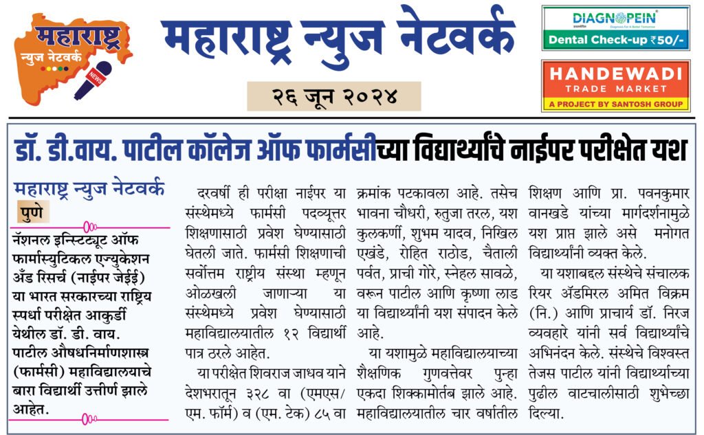 डॉ. डी.वाय. पाटील कॉलेज ऑफ फार्मसीच्या विद्यार्थ्यांचे नाईपर परीक्षेत यश