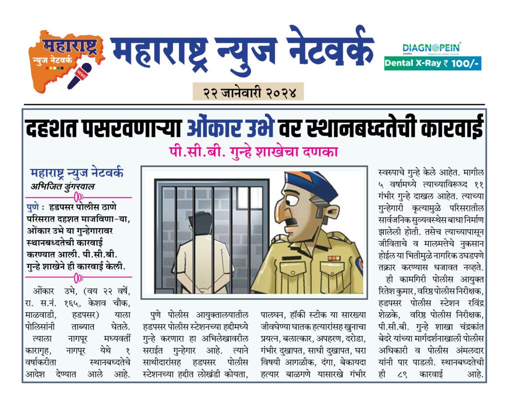 पुणे:- हडपसर पोलीस ठाणे परिसरात दहशत माजविणा-या, ओंकार उभे या गुन्हेगारावर स्थानबध्दतेची कारवाई करण्यात आली. पी.सी.बी. गुन्हे शाखेने ही कारवाई केली.