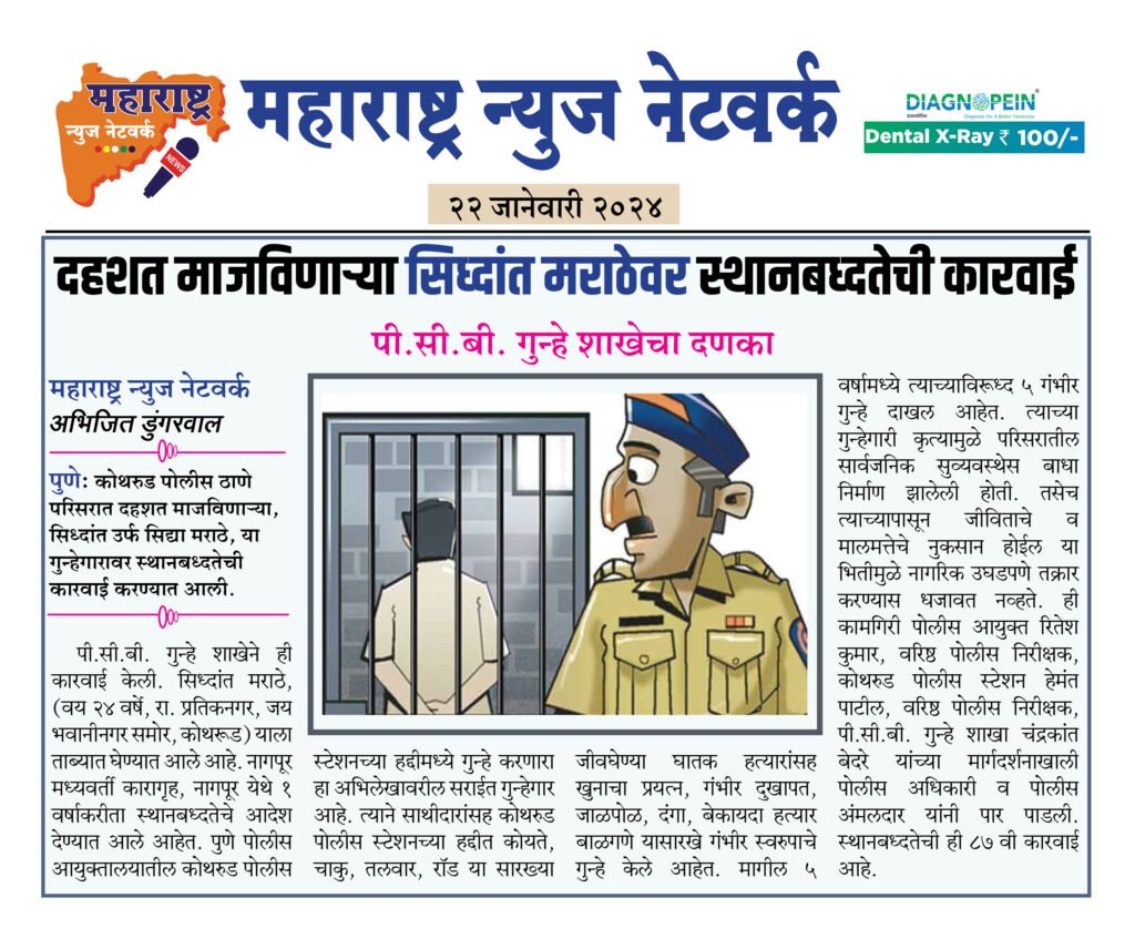 पी.सी.बी. गुन्हे शाखेने ही कारवाई केली. सिध्दांत मराठे, (वय २४ वर्षे, रा. प्रतिकनगर, जय भवानीनगर समोर, कोथरूड) याला ताब्यात घेण्यात आले आहे. नागपूर मध्यवर्ती कारागृह, नागपूर येथे १ वर्षाकरीता स्थानबध्दतेचे आदेश देण्यात आले आहेत. पुणे पोलीस आयुक्तालयातील कोथरुड पोलीस स्टेशनच्या हद्दीमध्ये गुन्हे करणारा हा अभिलेखावरील सराईत गुन्हेगार आहे. त्याने साथीदारांसह कोथरुड पोलीस स्टेशनच्या हद्दीत कोयते, चाकु, तलवार, रॉड या सारख्या जीवघेण्या घातक हत्यारांसह खुनाचा प्रयत्न, गंभीर दुखापत, जाळपोळ, दंगा, बेकायदा हत्यार बाळगणे यासारखे गंभीर स्वरुपाचे गुन्हे केले आहेत. मागील ५ वर्षामध्ये त्याच्याविरूध्द ५ गंभीर गुन्हे दाखल आहेत. त्याच्या गुन्हेगारी कृत्यामुळे परिसरातील सार्वजनिक सुव्यवस्थेस बाधा निर्माण झालेली होती. तसेच त्याच्यापासून जीविताचे व मालमत्तेचे नुकसान होईल या भितीमुळे नागरिक उघडपणे तक्रार करण्यास धजावत नव्हते. ही कामगिरी पोलीस आयुक्त रितेश कुमार, वरिष्ठ पोलीस निरीक्षक, कोथरुड पोलीस स्टेशन हेमंत पाटील, वरिष्ठ पोलीस निरीक्षक, पी.सी.बी. गुन्हे शाखा चंद्रकांत बेदरे यांच्या मार्गदर्शनाखाली पोलीस अधिकारी व पोलीस अंमलदार यांनी पार पाडली. स्थानबध्दतेची ही ८७ वी कारवाई आहे.