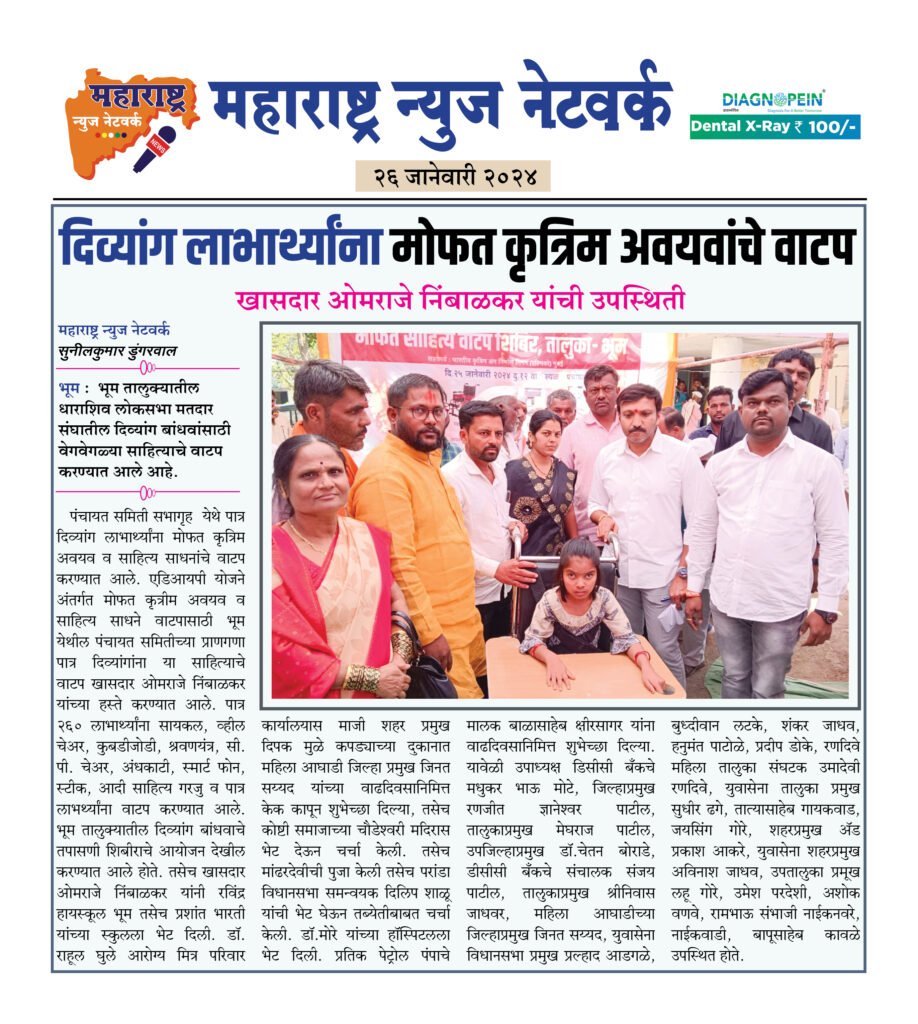 पंचायत समिती सभागृह येथे पात्र दिव्यांग लाभार्थ्यांना मोफत कृत्रिम अवयव व साहित्य साधनांचे वाटप करण्यात आले. एडिआयपी योजने अंतर्गत मोफत कृत्रीम अवयव व साहित्य साधने वाटपासाठी भूम येथील पंचायत समितीच्या प्राणगणा पात्र दिव्यांगांना या साहित्याचे वाटप खासदार ओमराजे निंबाळकर यांच्या हस्ते करण्यात आले. पात्र २६० लाभार्थ्यांना सायकल, व्हील चेअर, कुबडीजोडी, श्रवणयंत्र, सी. पी. चेअर, अंधकाटी, स्मार्ट फोन, स्टीक, आदी साहित्य गरजु व पात्र लाभर्थ्यांना वाटप करण्यात आले. भूम तालुक्यातील दिव्यांग बांधवाचे तपासणी शिबीराचे आयोजन देखील करण्यात आले होते. तसेच खासदार ओमराजे निंबाळकर यांनी रविंद्र हायस्कूल भूम तसेच प्रशांत भारती यांच्या स्कुलला भेट दिली. डॉ. राहूल घुले आरोग्य मित्र परिवार कार्यालयास माजी शहर प्रमुख दिपक मुळे कपड्याच्या दुकानात महिला आघाडी जिल्हा प्रमुख जिनत सय्यद यांच्या वाढदिवसानिमित्त केक कापून शुभेच्छा दिल्या, तसेच कोष्टी समाजाच्या चौडेश्वरी मदिरास भेट देऊन चर्चा केली. तसेच मांढरदेवीची पुजा केली तसेच परांडा विधानसभा समन्वयक दिलिप शाळू यांची भेट घेऊन तब्येतीबाबत चर्चा केली. डॉ.मोरे यांच्या हॉस्पिटलला भेट दिली. प्रतिक पेट्रोल पंपाचे मालक बाळासाहेब क्षीरसागर यांना वाढदिवसानिमित्त शुभेच्छा दिल्या. यावेळी उपाध्यक्ष डिसीसी बँकचे मधुकर भाऊ मोटे, जिल्हाप्रमुख रणजीत ज्ञानेश्वर पाटील, तालुकाप्रमुख मेघराज पाटील, उपजिल्हाप्रमुख डॉ.चेतन बोराडे, डीसीसी बँकचे संचालक संजय पाटील, तालुकाप्रमुख श्रीनिवास जाधवर, महिला आघाडीच्या जिल्हाप्रमुख जिनत सय्यद, युवासेना विधानसभा प्रमुख प्रल्हाद आडगळे, बुध्दीवान लटके, शंकर जाधव, हनुमंत पाटोळे, प्रदीप डोके, रणदिवे महिला तालुका संघटक उमादेवी रणदिवे, युवासेना तालुका प्रमुख सुधीर ढगे, तात्यासाहेब गायकवाड, जयसिंग गोरे, शहरप्रमुख ॲड प्रकाश आकरे, युवासेना शहरप्रमुख अविनाश जाधव, उपतालुका प्रमूख लहू गोरे, उमेश परदेशी, अशोक वणवे, रामभाऊ संभाजी नाईकनवरे, नाईकवाडी, बापूसाहेब कावळे उपस्थित होते.