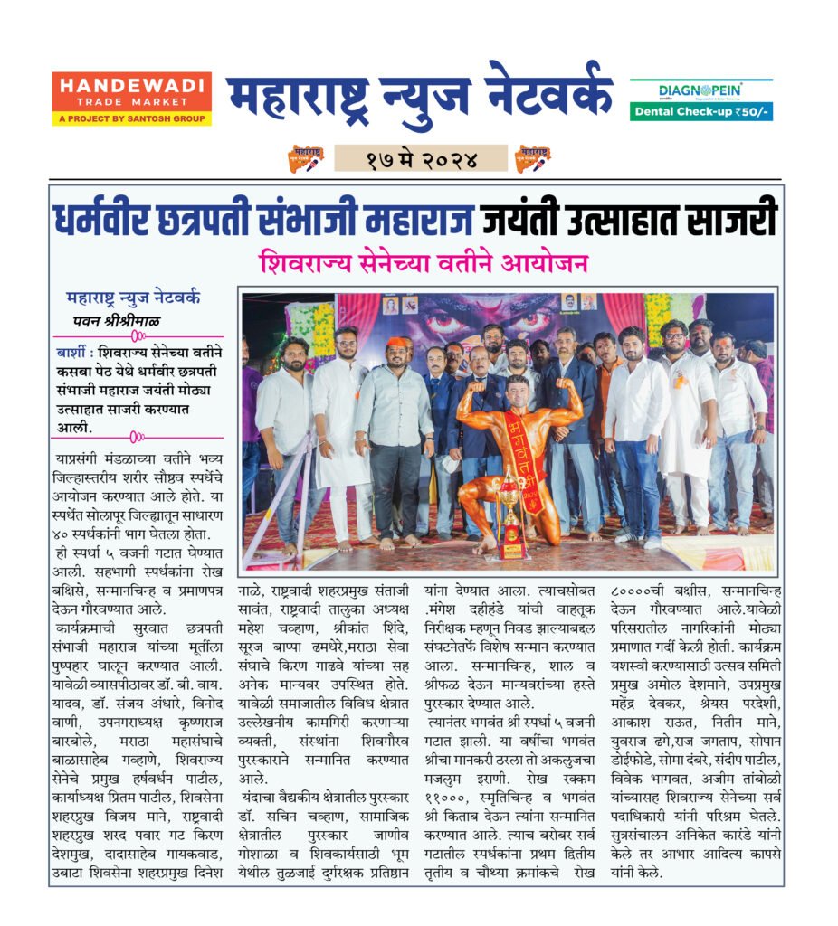 बार्शी : शिवराज्य सेनेच्या वतीने कसबा पेठ येथे धर्मवीर छत्रपती संभाजी महाराज जयंती मोठ्या उत्साहात साजरी करण्यात आली.