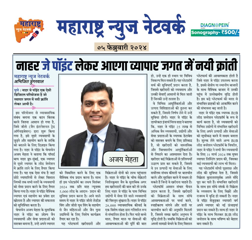 इस परियोजना से व्यावसायिक संबंध बनाना एक बटन क्लिक करने जितना आसान हो गया है, जिसे जीतो (जैन इंटरनेशनल ट्रेड ऑर्गनाइजेशन) द्वारा शुरू किया गया है, इसे दूसरे व्यवसायों के जुड़ने और सहयोग करने के तरीके को बदलने के लिए डिज़ाइन किया गया है। नाहर जे पॉइंट के चेयरमेन अजय मेहता ने बताया कि पॉवर्ड बाय नाहर ग्रुप-मुंबई, एक व्यापार से दूसरे व्यापार के लीड जेनरेशन में क्रांति लाने के लिए तैयार किया गया है। यह एक ऐसा मंच है जहां छोटे व्यापारियों से लेकर विशाल निगमों तक सभी स्तरों के व्यवसायों को सेवा प्रदान करने के लिए तैयार किया गया है। नाहर जे पॉइंट वैश्विक व्यापार एवं सहयोग का प्रवेश द्वार खोलता है और व्यापार की सफलता को सुनिश्चित करता है। चेयरमेन अजय मेहता के मुताबिक नाहर जे पॉइंट का उद्देश्य जैन व्यवसायों और सेवा प्रदाताओं को सशक्त बनाना है, उन्हें अपने व्यापार को विकसित करने के लिए एक वैश्विक मंच प्रदान करना है। साथ ही इस प्लेटफ़ॉर्म का लक्ष्य सितंबर 2024 तक प्रति माह न्यूनतम 5,000 लीड के आदान- प्रदान की सुविधा प्रदान करना है। आने वाले समय में नाहर जे पॉइंट जीतो लेडीज़ विंग और जीतो यूथ विंग के सहयोग से जैन महिलाओं और जैन युवा उद्यमियों के लिए विशेष कार्यक्रम तैयार कर रहा है। यह प्लेटफार्म खरीददारों और विक्रेताओं दोनों को लाभ पहुंचाता है। नाहर जे पॉइंट के चीफ सेक्रेटरी नितीनकुमार जैन के मुताबिक अगर हम खरीददारों की बात करें तो उनके लिए नाहर जे पॉइंट के पास विभिन्न उद्योगों में सेवा देने वाले व्यवसायों की विस्तृत श्रृंखला है। नाहर जे पॉइंट 28,000 व्यावसायिक कीवर्ड के एक विशेष संग्रह द्वारा गतिशील रूप से संचालित होता है। फिर चाहे कच्चे माल, तैयार माल या सेवाओं की आवश्यकताओं की पूर्ति की बात हो, उन्हें एक ही स्थान पर विविध विकल्प मिल सकते हैं। यह प्लेटफ़ॉर्म सर्च की सुविधाएँ प्रदान करता है, जिससे खरीदारों को व्यवसाय और उनकी सेवाएँ आसानी से मिल जाती हैं जिनकी उन्हें तलाश है। वे विभिन्न आपूर्तिकर्ताओं और उत्पाद विशिष्टताओं की तुलना कर सकते हैं, जिससे निर्णय लेने में उन्हें सुविधा होगी। नाहर जे पॉइंट के डायरेक्टर इंजार्च निरव शाह ने बताया कि, नाहर जे पॉइंट 25 लाख से अधिक जैन व्यवसायों, उद्योगों और सेवा प्रदाताओं के व्यापक डेटाबेस को सशक्त बनाने के लिए प्रतिबद्ध है, जो खरीदारों को वास्तविक और विश्वसनीय आपूर्तिकर्ताओं से निपटने का आश्वासन देता है। खरीदार कई विक्रेताओं से प्रतिस्पर्धी उद्धरण प्राप्त कर सकते हैं, जिससे वे उन उत्पादों या सेवाओं के लिए सर्वोत्तम संभव कीमतों पर बातचीत करने और सुरक्षित करने में सक्षम हो सकते हैं जिन्हें वे खरीदना चाहते हैं। प्लेटफॉर्म आसान संचार चैनल प्