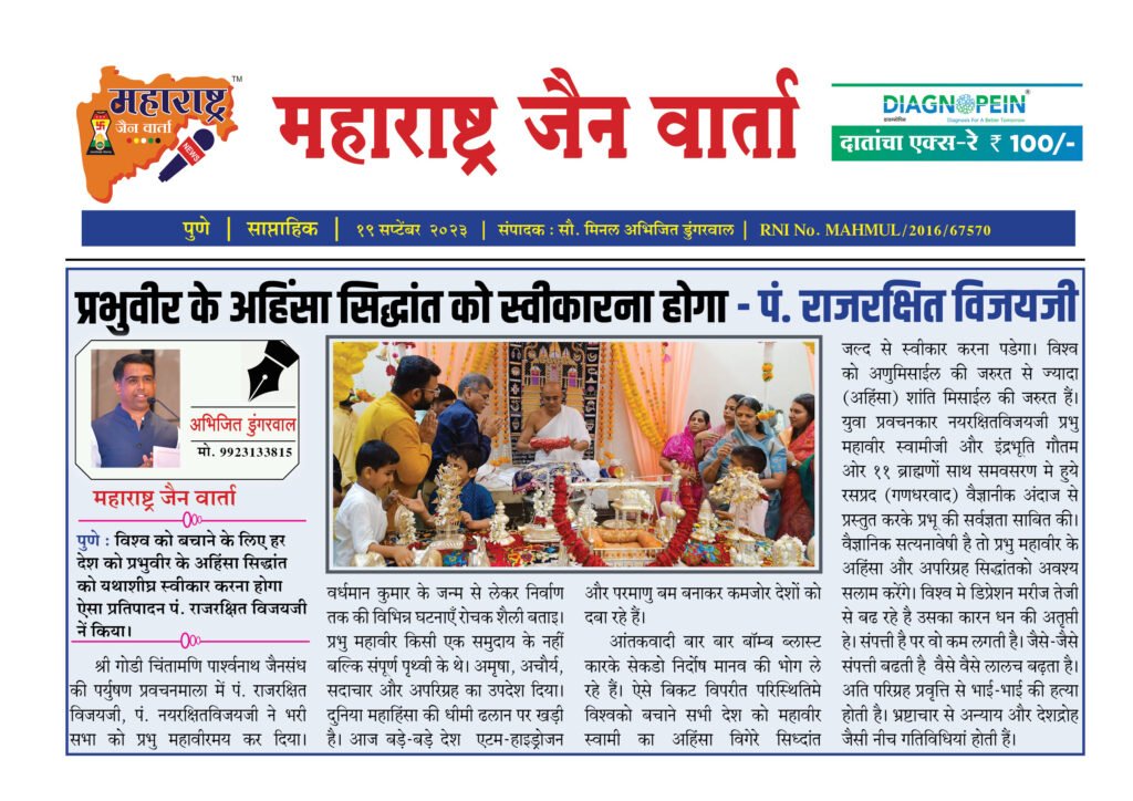 ← Back to Homepage प्रभुवीर के अहिंसा सिद्धांत को स्वीकारना होगा – पं. राजरक्षित विजयजी maharashtrajainwarta • Maharashtra Jain Warta, MJW Daily News(Post Slider) • November 16, 2023 📥 Download News PDF