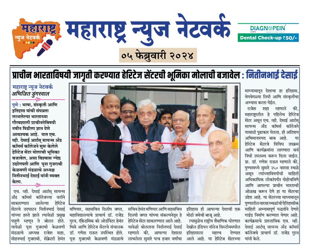 एच. व्ही. देसाई आर्टस् सायन्स अँड कॉमर्स कॉलेजच्या वतीने साकारण्यात आलेल्या हेरिटेज सेंटरचे उदघाटन नितीनभाई देसाई यांच्या हस्ते झाले त्यावेळी प्रमुख पाहुणे म्हणून ते बोलत होते.