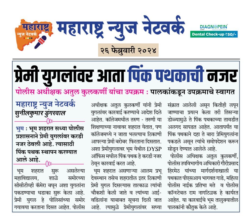 अशा प्रेमीयुगलावर भूम येथील DYSP ऑफिस मधील पिंक पथक हे करडी नजर ठेवून कारवाई करत आहे. भूम शहरात असणाऱ्या आलम प्रभू देवस्थान तसेच शहरातील इतर ठिकाणी प्रेमी युगल दिसल्यास तात्काळ त्यांची चौकशी केली जाते व त्यांच्या आई-वडिलांना याबाबत सूचना दिली जात आहे.