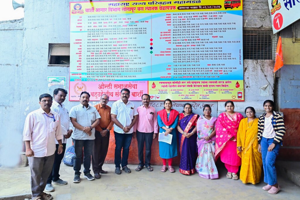 बार्शी : ओन्ली समाजसेवा बहुउद्देशीय संस्था, बार्शी यांच्या पुढाकाराने आणि संस्थेकडे आलेल्या मागणीनुसार बार्शी आगार बस स्थानकाच्या नव्या वेळापत्रकाचे अनावरण करण्यात आले. हा कार्यक्रम आगार प्रमुख श्रीमती मधुरा संदिपान जाधवर यांच्या हस्ते पार पडला.
