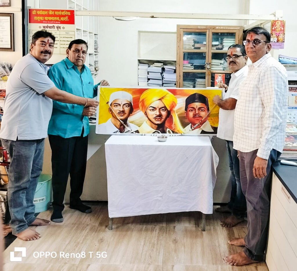 बार्शी : बार्शी येथील श्री वर्धमान जैन सार्वजनिक तालुका वाचनालय बार्शी येथे महान क्रांतीकारक भगतसिंह, सुखदेव, आणि राजगुरु यांच्या प्रतिमेचे पुजन करून शहिद दिनी अभिवादन करण्यात आले.