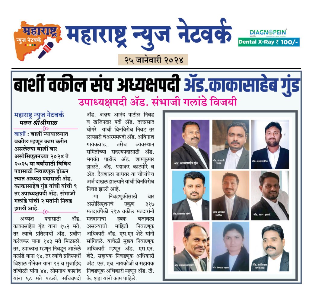 बार्शी : बार्शी न्यायालयात वकील म्हणून काम करीत असलेल्या बार्शी बार असोसिएशनच्या २०२४ ते २०२५ या वर्षासाठी विविध पदासाठी निवडणूक होऊन त्यात अध्यक्ष पदासाठी ॲड. काकासाहेब गुंड यांची यांची ९ तर उपाध्यक्षपदी ॲड. संभाजी गलांडे यांची २ मतांनी निवड झाली आहे.