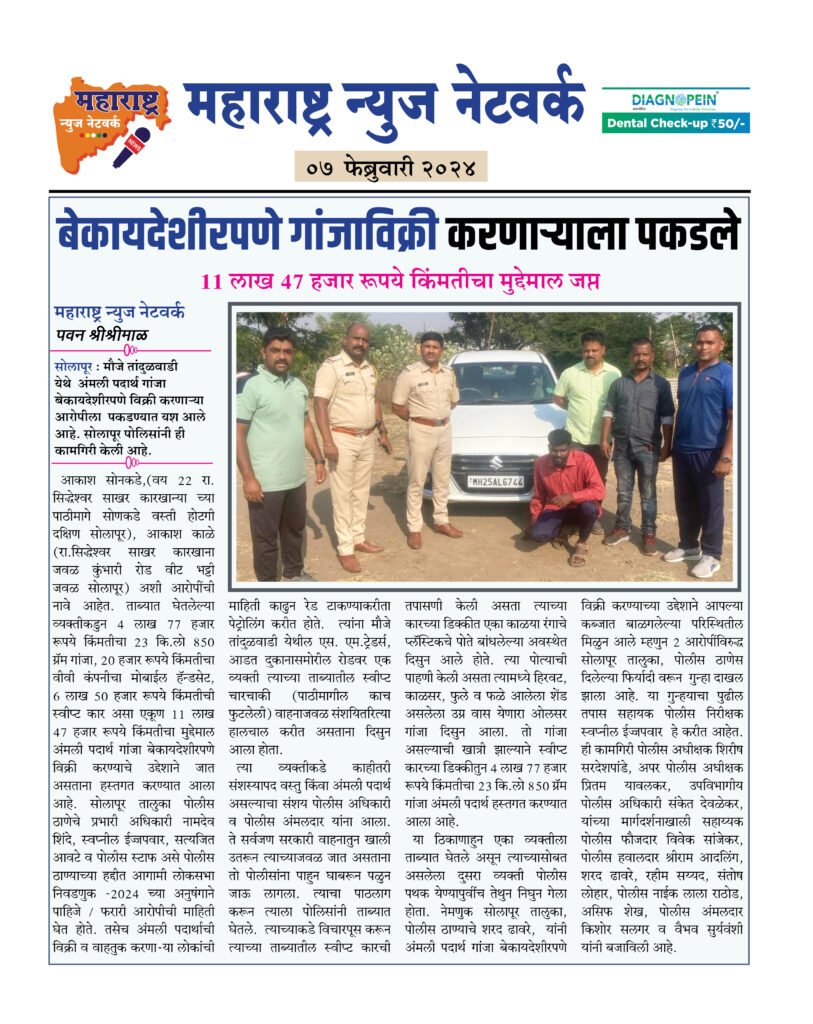 आकाश सोनकडे,(वय 22 रा. सिद्धेश्वर साखर कारखान्या च्या पाठीमागे सोणकडे वस्ती होटगी दक्षिण सोलापूर), आकाश काळे (रा.सिद्धेश्वर साखर कारखाना जवळ कुंभारी रोड वीट भट्टी जवळ सोलापूर) अशी आरोपींची नावे आहेत. ताब्यात घेतलेल्या व्यक्तीकडुन 4 लाख 77 हजार रूपये किंमतीचा 23 कि.लो 850 ग्रॅम गांजा, 20 हजार रूपये किंमतीचा वीवी कंपनीचा मोबाईल हॅन्डसेट, 6 लाख 50 हजार रूपये किंमतीची स्वीप्ट कार असा एकूण 11 लाख 47 हजार रूपये किंमतीचा मुद्देमाल अंमली पदार्थ गांजा बेकायदेशीरपणे विक्री करण्याचे उद्देशाने जात असताना हस्तगत करण्यात आला आहे. सोलापूर तालुका पोलीस ठाणेचे प्रभारी अधिकारी नामदेव शिंदे, स्वप्नील ईज्जपवार, सत्यजित आवटे व पोलीस स्टाफ असे पोलीस ठाण्याच्या हद्दीत आगामी लोकसभा निवडणुक -2024 च्या अनुषंगाने पाहिजे / फरारी आरोपीची माहिती घेत होते. तसेच अंमली पदार्थाची विक्री व वाहतुक करणा-या लोकांची माहिती काढुन रेड टाकण्याकरीता पेट्रोलिंग करीत होते. त्यांना मौजे तांदुळवाडी येथील एस. एम.ट्रेडर्स, आडत दुकानासमोरील रोडवर एक व्यक्ती त्याच्या ताब्यातील स्वीप्ट चारचाकी (पाठीमागील काच फुटलेली) वाहनाजवळ संशयितरित्या हालचाल करीत असताना दिसुन आला होता.