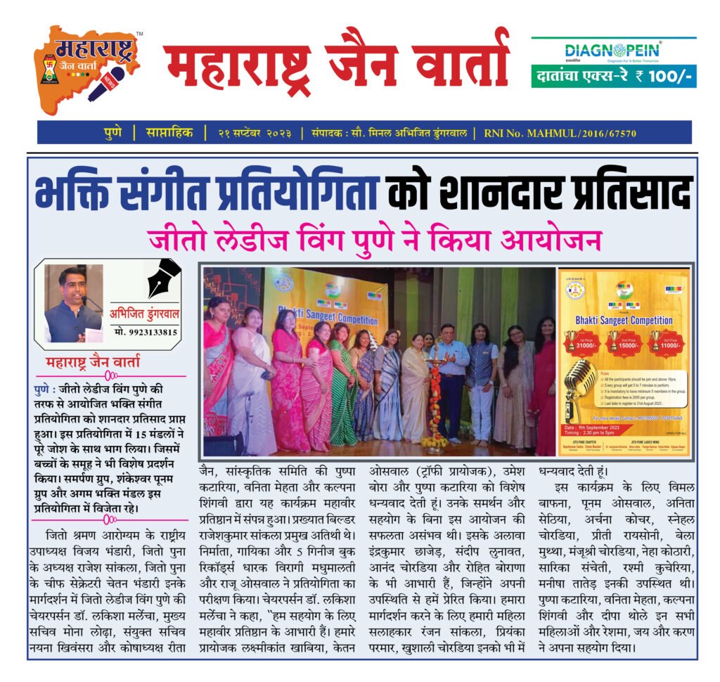 ← Back to Homepage भक्ति संगीत प्रतियोगिता को शानदार प्रतिसाद maharashtrajainwarta • Maharashtra Jain Warta, MJW Daily News(Post Slider) • November 16, 2023 📥 Download News PDF जीतो लेडीज विंग पुणे ने किया आयोजन