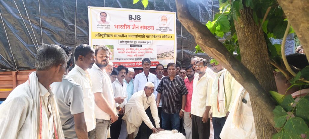 पूरामुळे जनजीवन विस्कळीत झाले असून, जनावरांसाठी चाऱ्याची तीव्र टंचाई निर्माण झाली आहे. या पार्श्वभूमीवर भारतीय जैन संघटनेच्या पुढाकाराने वाशी तालुक्यातील पारगाव आणि जनकापूर येथील पूरग्रस्त भागात चारा वाटप करण्यात आले. या उपक्रमामुळे असंख्य गोधनांना दिलासा मिळाला आहे.