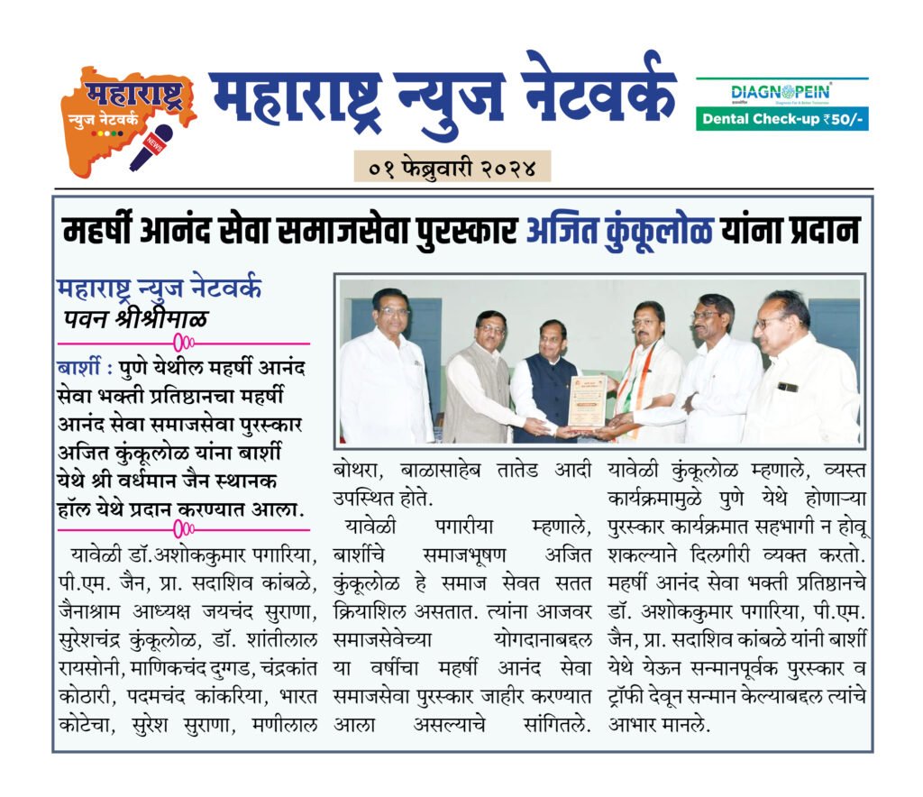 बार्शी : पुणे येथील महर्षी आनंद सेवा भक्ती प्रतिष्ठानचा महर्षी आनंद सेवा समाजसेवा पुरस्कार अजित कुंकूलोळ यांना बार्शी येथे श्री वर्धमान जैन स्थानक हॉल येथे प्रदान करण्यात आला.