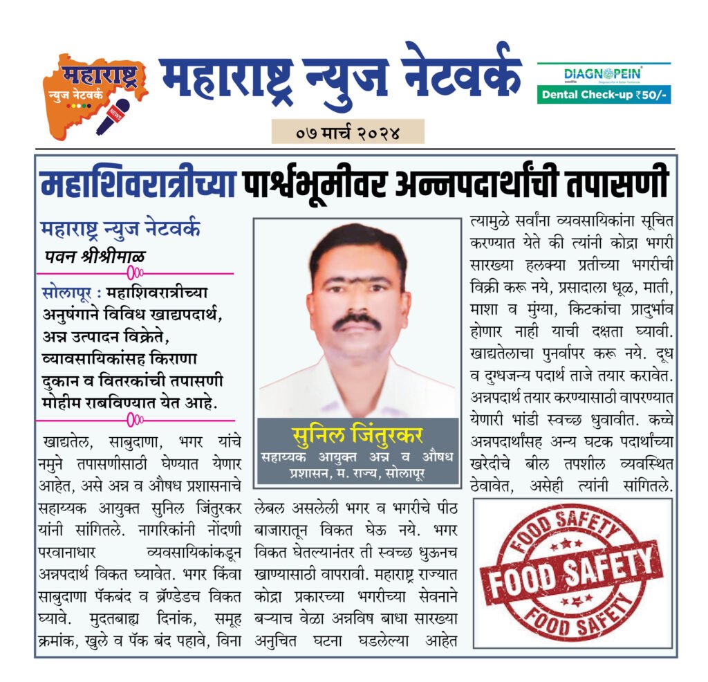 सोलापूर : महाशिवरात्रीच्या अनुषंगाने विविध खाद्यपदार्थ, अन्न उत्पादन विक्रेते, व्यावसायिकांसह किराणा दुकान व वितरकांची तपासणी मोहीम राबविण्यात येत आहे.