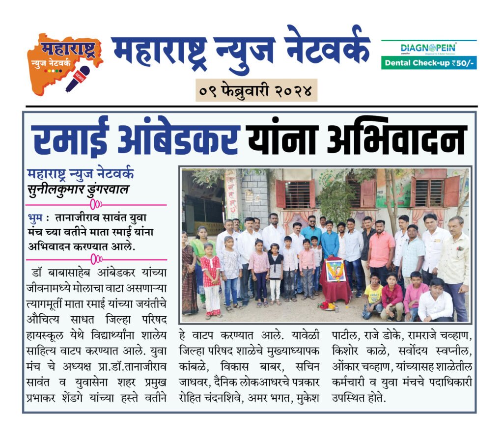 डॉ बाबासाहेब आंबेडकर यांच्या जीवनामध्ये मोलाचा वाटा असणाऱ्या त्यागमूर्ती माता रमाई यांच्या जयंतीचे औचित्य साधत जिल्हा परिषद हायस्कूल येथे विद्यार्थ्यांना शालेय साहित्य वाटप करण्यात आले. युवा मंच चे अध्यक्ष प्रा.डॉ.तानाजीराव सावंत व युवासेना शहर प्रमुख प्रभाकर शेंडगे यांच्या हस्ते वतीने हे वाटप करण्यात आले. यावेळी जिल्हा परिषद शाळेचे मुख्याध्यापक कांबळे, विकास बाबर, सचिन जाधवर, दैनिक लोकआधरचे पत्रकार रोहित चंदनशिवे, अमर भगत, मुकेश पाटील, राजे डोके, रामराजे चव्हाण, किशोर काळे, सर्वोदय स्वप्नील, ओंकार चव्हाण, यांच्यासह शाळेतील कर्मचारी व युवा मंचचे पदाधिकारी उपस्थित होते.