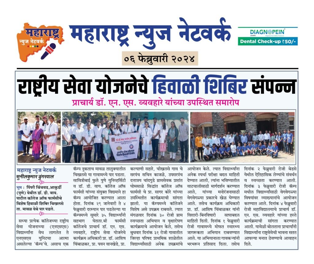 सध्या प्रत्येक कॉलेजच्या राष्ट्रीय सेवा योजनाच्या (एनएसएस) विद्यार्थ्यांना वेध लागलेत ते एनएसएस युनिटचा आत्मा असलेल्या ‘कॅम्प’चे. असाच एक कॅम्प नुकताच मावळ तालुक्यातील चिखलसे या गावामध्ये पार पडला. सावित्रीबाई फुले पुणे युनिव्हर्सिटी व डॉ. डी. वाय. कॉलेज ऑफ फार्मसी यांच्या संयुक्त विद्यमाने हा कॅम्प आयोजित करण्यात आला होता. दिनांक २९ जानेवारी ते ४ फेब्रुवारी दरम्यान पार पडलेल्या या कॅम्पमध्ये सुमारे ३५ विद्यार्थ्यांनी सहभाग घेतला.बी फार्मसी कॉलेजचे प्राचार्य डॉ. एन. एस. व्यवहारे, राष्ट्रीय सेवा योजनेचे कार्यक्रम अधिकारी प्रा. डॉ. आशिष चिंबाळकर, प्रा. पवन वानखेडे, प्रा. कल्याणी सहारे, चीखलसे गाव चे सरपंच सचिन काजळे, उपसरपंच दत्तात्रय चांदगुडे ग्रामसेवक प्रशांत घोमसाळे सिद्धांत कॉलेज ऑफ फार्मसी चे प्रा. सागर कोरे यांच्या उपस्थितीत कार्यक्रमाची सांगता झाली. या कॅम्पमध्ये कॉलेजने विशेष असे उपक्रम राबवले. त्यात मंगळवार दिनांक ३०, रोजी ग्राम स्वच्छता अभियान व वृक्षारोपण कार्यक्रमाचे आयोजन केले, तसेच बुधवार दिनांक ३१ रोजी गावातील जिल्हा परिषद प्राथमिक शाळेतील विद्यार्थ्यांसाठी अनेक उपक्रमांचे आयोजन केले. त्यात विद्यार्थ्यांना अनेक स्पर्धा परीक्षा बद्दल माहिती देण्यात आली, त्यांना भविष्यातील वाटचालीसाठी मार्गदर्शन करण्यात आले, यांच्या मनोरंजनासाठी वेगवेगळ्या प्रकारचे खेळ घेण्यात आले. तसेच कार्यक्रम अधिकारी प्रा. डॉ. आशिष चिंबाळकर यांनी विशारी-बिनविषारी सापाबद्दल माहिती दिली. दिनांक १ फेब्रुवारी रोजी गावामध्ये मोफत स्वास्थ्य जागरूकता अभियान राबवण्यात आले. या अभियानाला गावकऱ्यांनी भरभरून प्रतिसाद दिला. तसेच दिनांक २ फेब्रुवारी रोजी बेडसे येथील ऐतिहासिक लेण्यांचे संवर्धन व स्वच्छता करण्यात आली. दिनांक ३ फेब्रुवारी रोजी कॅम्प मधील विद्यार्थ्यांसाठी वेगवेगळ्या विषयांवर व्याख्यानांचे आयोजन करण्यात आले. दिनांक ४ फेब्रुवारी रोजी महाविद्यालयाचे प्राचार्य डॉ. एन. एस. व्यवहारे यांच्या हस्ते कार्यक्रमाची सांगता करण्यात आली. यावेळी बोलताना प्राचार्यांनी विद्यार्थ्यांना राष्ट्रसेवेची भावना सतत आपल्या मनात ठेवण्याचे आवाहन दिले.