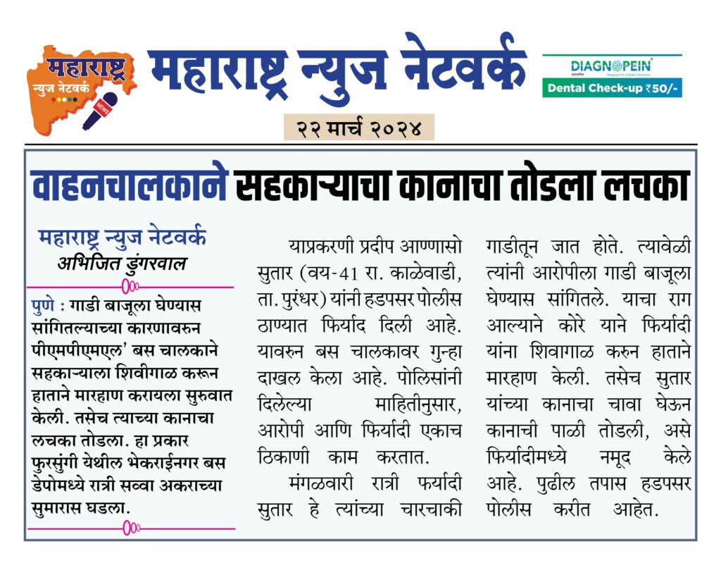 पुणे : गाडी बाजूला घेण्यास सांगितल्याच्या कारणावरुन पीएमपीएमएल’ बस चालकाने सहकाऱ्याला शिवीगाळ करून हाताने मारहाण करायला सुरुवात केली. तसेच त्याच्या कानाचा लचका तोडला. हा प्रकार फुरसुंगी येथील भेकराईनगर बस डेपोमध्ये रात्री सव्वा अकराच्या सुमारास घडला.