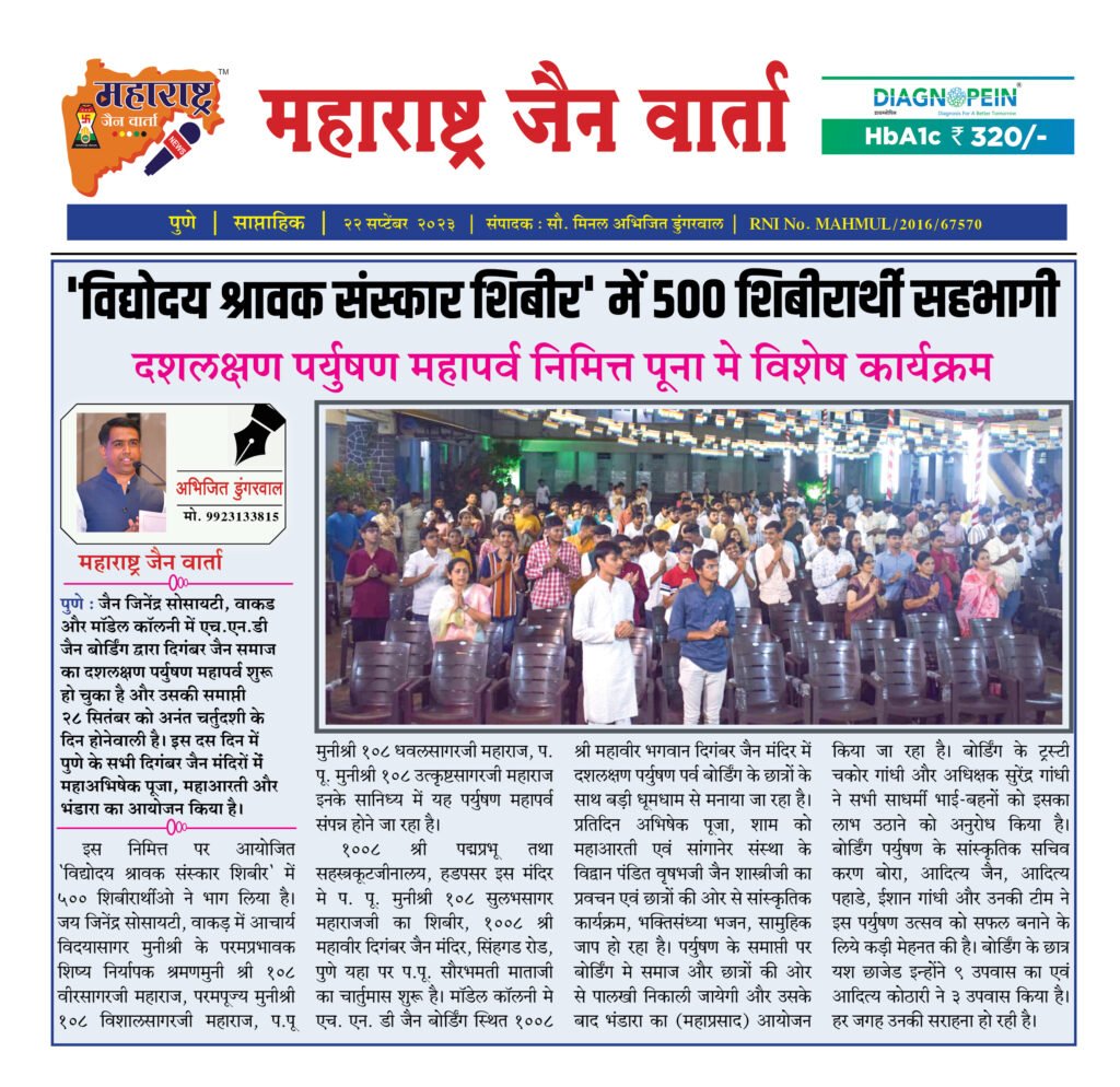 ← Back to Homepage ‘विद्योदय श्रावक संस्कार शिबीर’ में 500 शिबीरार्थी सहभागी दशलक्षण पर्युषण महापर्व निमित्त पूना मे विशेष कार्यक्रम maharashtrajainwarta • Maharashtra Jain Warta, MJW Daily News(Post Slider) • November 16, 2023 📥 Download News PDF