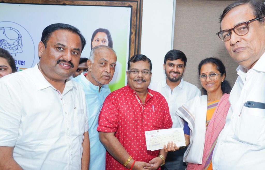 धनादेश सुपूर्त करताना महाराष्ट्र काँग्रेसचे सरचिटणीस अभय छाजेड, राष्ट्रवादीचे शरद पवार गटाचे प्रशांत जगताप, मनिष संचेती, विजय शिंगवी आदी मान्यवर उपस्थित होते.