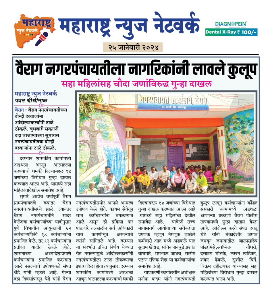 दरम्यान शासकीय कामांमध्ये अडथळा आणून आत्महत्या करण्याची धमकी दिल्याबद्दल १४ जणांच्या विरोधात गुन्हा दाखल करण्यात आला आहे. यामध्ये सहा महिलांचादेखील समावेश आहे. सुमारे अडीच वर्षांपूर्वी वैराग ग्रामपंचायतचे रूपांतर वैराग नगरपंचायतीमध्ये झाले. त्यानंतर वैराग नगरपंचायतीने सादर केलेल्या कर्मचाऱ्यांच्या यादीनुसार पुणे विभागीय आयुक्तांनी ६२ कर्मचाऱ्यांपैकी १८ कर्मचाऱ्यांना प्रमाणित केले. तर १३ कर्मचाऱ्यांना प्रतीक्षा यादीत ठेवले होते. शासनाच्या अध्यादेशाप्रमाणे कर्मचाऱ्यांना प्रमाणित करण्यात आले नसल्याचे उपोषणकर्ते संपत धेंडे यांनी म्हटले आहे. गेल्या दहा दिवसांपासून धेंडे यांनी वैराग नगरपंचायतीसमोर आपले आमरण उपोषण केले होते. कायम सेवेतून सात कर्मचाऱ्यांना वगळण्यात आले असून ही प्रक्रिया पार पाडणारे तत्कालीन सर्व अधिकारी यास कारणीभूत असल्याचे त्यांनी सांगितले आहे. दरम्यान या संदर्भात उचित निर्णय घेण्यात येत नसल्यामुळे आंदोलनकर्त्यांनी नगरपंचायतीला टाळा ठोकण्याचा इशारा दिला होता त्यानुसार .दरम्यान शासकीय कामांमध्ये अडथळा आणून आत्महत्या करण्याची धमकी दिल्याबद्दल १४ जणांच्या विरोधात गुन्हा दाखल करण्यात आला आहे .यामध्ये सहा महिलांचा देखील समावेश आहे. यावेळी राज्य मागासवर्ग आयोगाच्या सर्वेकरीता प्रगणक म्हणून नेमणूक झालेले कर्मचारी आत मध्ये अडकले यात सुदाम खेंदाड, सचिन पानबुडे,प्रशांत वाघमारे, रामभाऊ जाधव, सलीम पठाण रफिक शेख या कर्मचाऱ्यांचा समावेश आहे. याप्रकरणी कार्यालयीन अधीक्षक मनीषा कदम यांनी नगरपंचायती कुलूप लावून कर्मचाऱ्यांना कोंडत सरकारी कामांमध्ये अडथळा आणल्या प्रकरणी वैराग पोलीस ठाण्यामध्ये पुन्हा दाखल केला आहे. आंदोलन करते संपत दगडू धेंडे यांनी बेकादेशीर जमाव जमवून जमावातील बाळासाहेब पांढरमिसे,स्वप्निल चौधरी, दत्तात्रय घोडके, लखन खांडेकर, शंकर ढेकळे, सुशील बिर्गे, विक्रम दहीटणकर यांच्यासह सहा महिलांच्या विरोधात गुन्हा दाखल करण्यात आला आहे.