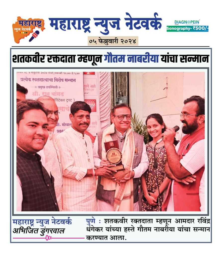 पुणे : शतकवीर रक्तदाता म्हणून आमदार रविंद्र धंगेकर यांच्या हस्ते गौतम नाबरीया यांचा सन्मान करण्यात आला.