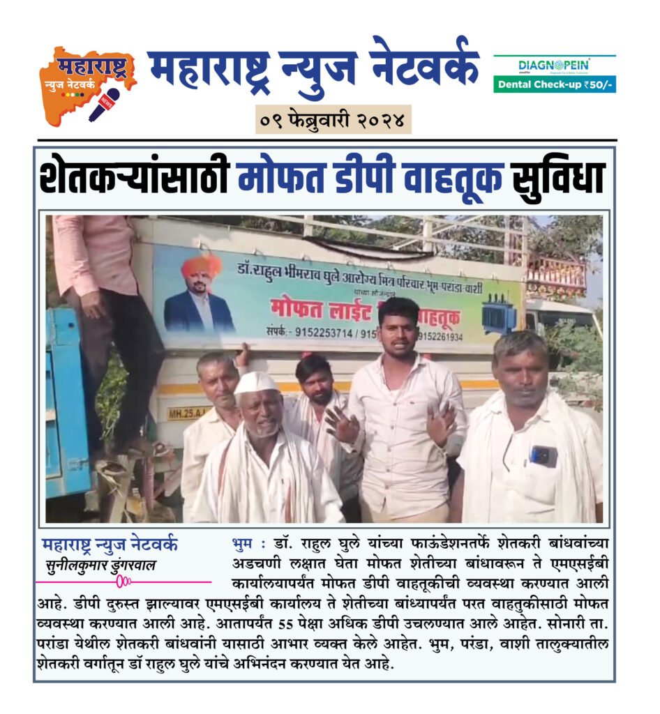भुम : डॉ. राहुल घुले यांच्या फाऊंडेशनतर्फे शेतकरी बांधवांच्या अडचणी लक्षात घेता मोफत शेतीच्या बांधावरून ते एमएसईबी कार्यालयापर्यंत मोफत डीपी वाहतूकीची व्यवस्था करण्यात आली आहे. डीपी दुरुस्त झाल्यावर एमएसईबी कार्यालय ते शेतीच्या बांध्यापर्यंत परत वाहतुकीसाठी मोफत व्यवस्था करण्यात आली आहे. आतापर्यंत 55 पेक्षा अधिक डीपी उचलण्यात आले आहेत. सोनारी ता. परांडा येथील शेतकरी बांधवांनी यासाठी आभार व्यक्त केले आहेत. भुम, परंडा, वाशी तालुक्यातील शेतकरी वर्गातून डॉ राहुल घुले यांचे अभिनंदन करण्यात येत आहे.