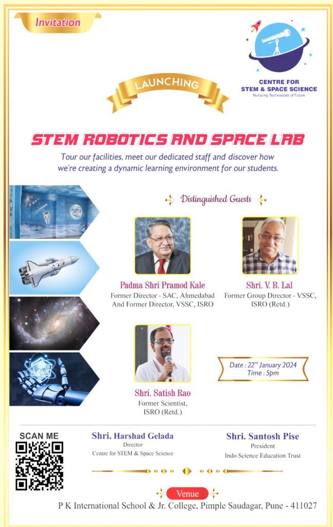 पुणे: सेंटर फॉर स्टेम अँड स्पेस सायन्स (Center for Stem and Space Science) तर्फे पी के इंटरनॅशनल स्कूल अॅड जुनिअर कॉलेज, येथे निर्माण करण्यात आलेल्या रोबोटिक्स व स्पेस लॅब चे उदघाटन करण्यात येणार आहे.