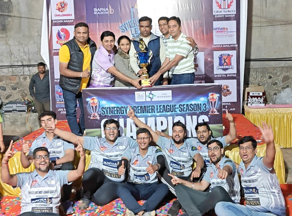 जैन सोशल ग्रुप पुणे सिनर्जी यांच्या पुढाकारातून आयोजित करण्यात आलेली सिनर्जी प्रीमियम लीग ही भव्य क्रिकेट स्पर्धा बिबेवाडी येथील स्ट्रायकर ग्राउंडवर मोठ्या जल्लोषात पार पडली. थरारक सामने, शिस्तबद्ध आयोजन आणि उत्कृष्ट खेळाडूवृत्ती यामुळे या स्पर्धेने उपस्थितांची मने जिंकली.