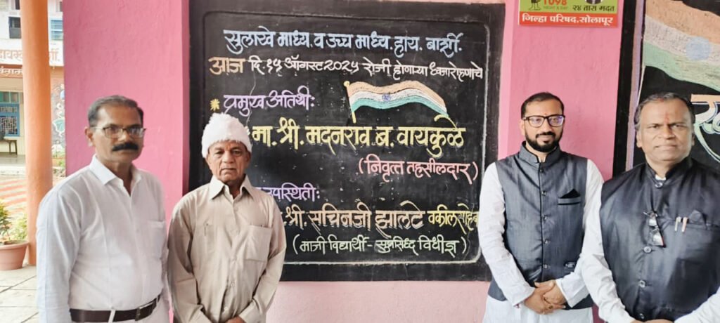 बार्शी : बार्शी येथील सुलाखे प्रशालेचे माजी विद्यार्थी आणि विधी क्षेत्रामध्ये राज्यभर नावलौकिक मिळवलेले सुप्रसिद्ध वकील ॲड. सचिन झालटे यांना स्वातंत्र्य दिनानिमित्त शाळेत झेंडा वंदना कार्यक्रमासाठी विशेष आमंत्रित करण्यात आले होते. या प्रसंगी शाळेच्या वतीने त्यांच्या कार्याचा गौरव करून त्यांचा सत्कार करण्यात आला.
