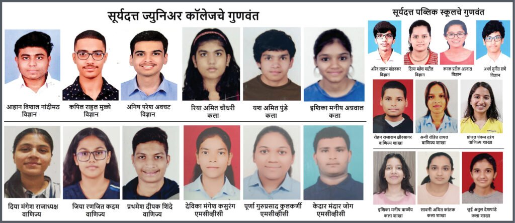 सूर्यदत्त ज्युनिअर कॉलेजच्या विज्ञान शाखेत आहान विशाल नांदीमठ (९१.८३ टक्के), कपिल राहुल मुळ्ये (८८.१७ टक्के), अनिष परेश अवचट (८६.८३ टक्के), वाणिज्य शाखेत दिया मंगेश राजाध्यक्ष (९४.१७ टक्के), जिया रणजित कदम (८७.१७ टक्के), प्रथमेश दीपक शिंदे (७८.५० टक्के), तर कला शाखेत रिया अमित चौधरी (८४.८३ टक्के), यश अमित पुंडे (८४.३३ टक्के), इशिका मनीष अग्रवाल (८४ टक्के), तर व्यावसायिक अभ्यासक्रमातून (एमसीव्हीसी) देविका मंगेश कसुरंग (६७.६७ टक्के), पूर्णा गुरुप्रसाद कुलकर्णी (६६.३३ टक्के), आणि केदार मंदार जोग (६० टक्के) यांनी अनुक्रमे प्रथम, द्वितीय व तृतीय क्रमांक पटकवला आहे. प्रा. डॉ. संजय बी चोरडिया म्हणाले की, कठोर परिश्रम, समर्पण आणि दृढनिश्चयाचे फळ नेहमीच चांगले मिळते आणि प्रत्येक विद्यार्थ्याने आपल्या पालकांच्या आणि शिक्षकांच्या अपेक्षा पूर्ण केल्या आहेत.