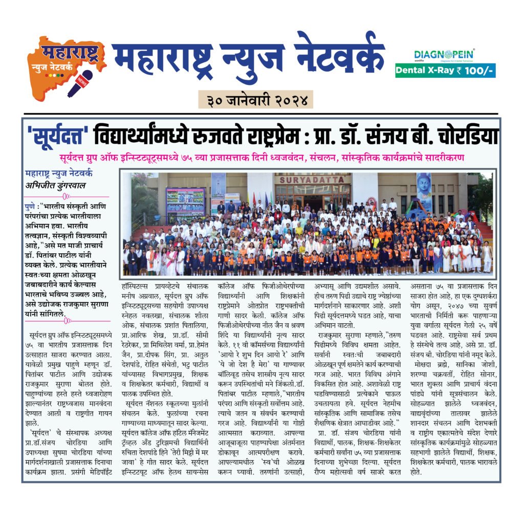 सूर्यदत्त ग्रुप ऑफ इन्स्टिट्यूट्समध्ये ७५ वा भारतीय प्रजासत्ताक दिन उत्साहात साजरा करण्यात आला. यावेळी प्रमुख पाहुणे म्हणून डॉ. पितांबर पाटील आणि उद्योजक राजकुमार सुराणा बोलत होते. पाहुण्यांच्या हस्ते हस्ते ध्वजारोहण झाल्यानंतर राष्ट्रध्वजास मानवंदना देण्यात आली व राष्ट्रगीत गायन झाले.