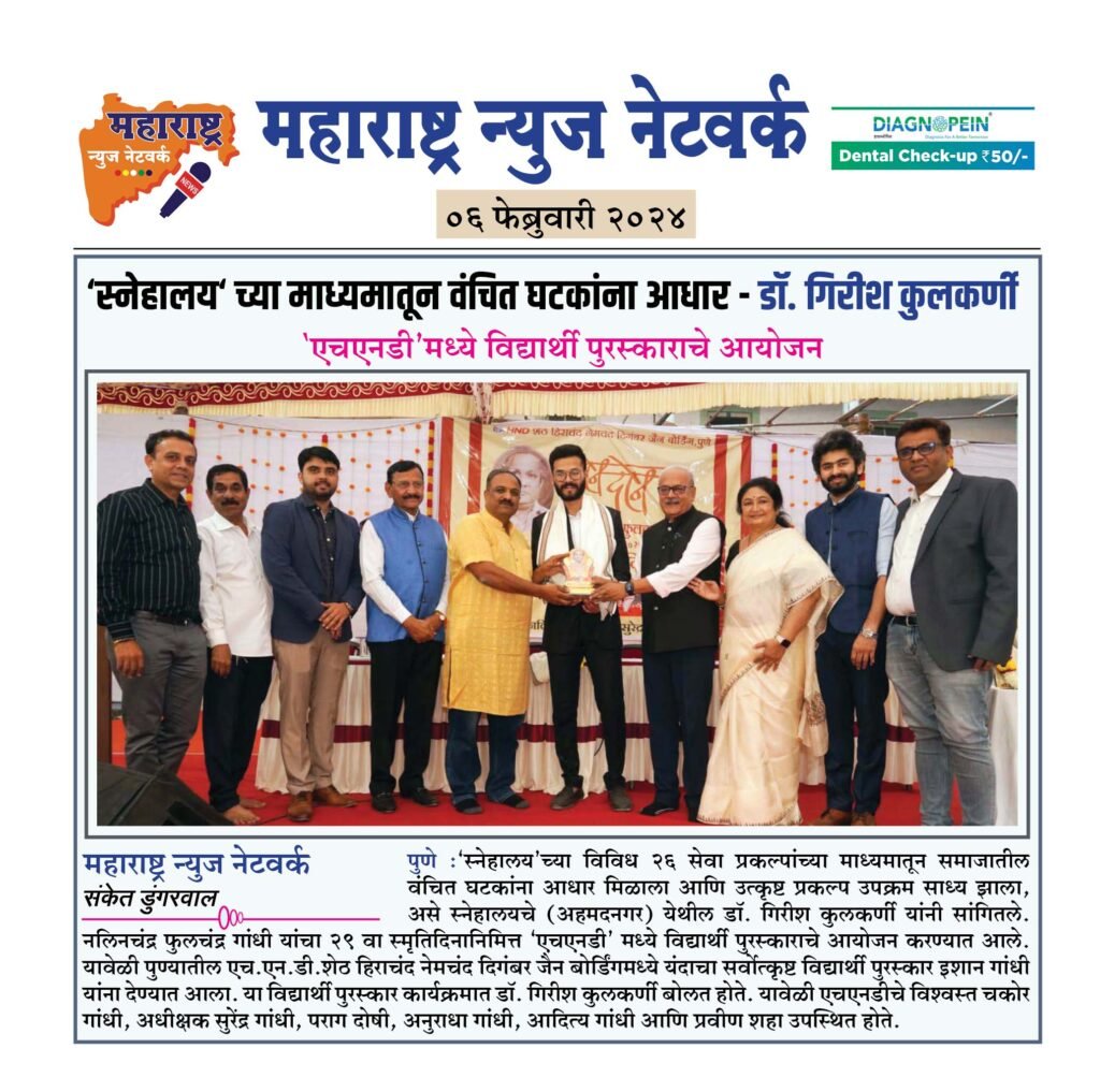 पुणे :‘स्नेहालय’च्या विविध २६ सेवा प्रकल्पांच्या माध्यमातून समाजातील वंचित घटकांना आधार मिळाला आणि उत्कृष्ट प्रकल्प उपक्रम साध्य झाला, असे स्नेहालयचे (अहमदनगर) येथील डॉ. गिरीश कुलकर्णी यांनी सांगितले. नलिनचंद्र फुलचंद्र गांधी यांचा २९ वा स्मृतिदिनानिमित्त ‘एचएनडी’मध्ये विद्यार्थी पुरस्काराचे आयोजन करण्यात आले. यावेळी पुण्यातील एच.एन. डी.शेठ हिराचंद नेमचंद दिगंबर जैन बोर्डिंगमध्ये यंदाचा सर्वोत्कृष्ट विद्यार्थी पुरस्कार इशान गांधी यांना देण्यात आला. या विद्यार्थी पुरस्कार कार्यक्रमात डॉ. गिरीश कुलकर्णी बोलत होते. यावेळी एचएनडीचे विश्वस्त चकोर गांधी, अधीक्षक सुरेंद्र गांधी, पराग दोषी, अनुराधा गांधी, आदित्य गांधी आणि प्रवीण शहा उपस्थित होते.