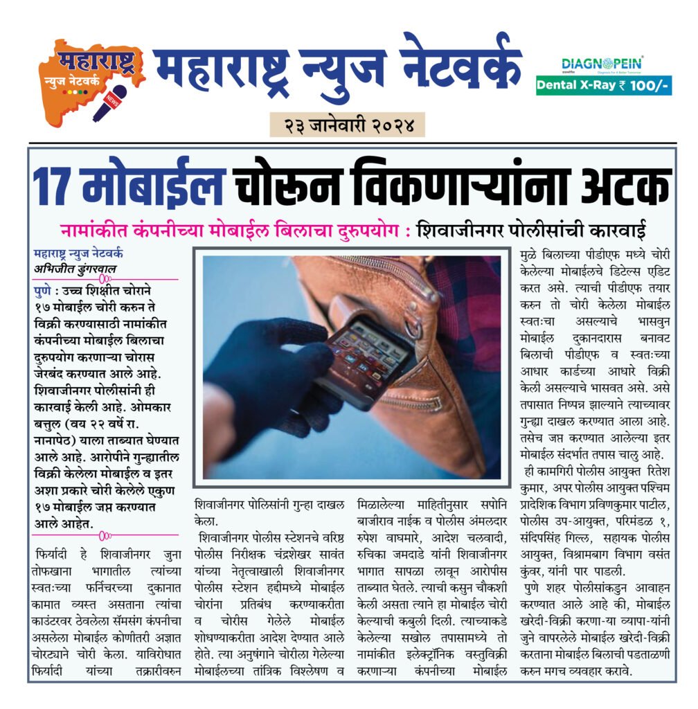 फिर्यादी हे शिवाजीनगर जुना तोफखाना भागातील त्यांच्या स्वतःच्या फर्निचरच्या दुकानात कामात व्यस्त असताना त्यांचा काउंटरवर ठेवलेला सॅमसंग कंपनीचा असलेला मोबाईल कोणीतरी अज्ञात चोरट्याने चोरी केला. याविरोधात फिर्यादी यांच्या तक्रारीवरुन शिवाजीनगर पोलिसांनी गुन्हा दाखल केला. शिवाजीनगर पोलीस स्टेशनचे वरिष्ठ पोलीस निरीक्षक चंद्रशेखर सावंत यांच्या नेतृत्वाखाली शिवाजीनगर पोलीस स्टेशन हद्दीमध्ये मोबाईल चोरांना प्रतिबंध करण्याकरीता व चोरीस गेलेले मोबाईल शोधण्याकरीता आदेश देण्यात आले होते. त्या अनुषंगाने चोरीला गेलेल्या मोबाईलच्या तांत्रिक विश्लेषण व मिळालेल्या माहितीनुसार सपोनि बाजीराव नाईक व पोलीस अंमलदार रुपेश वाघमारे, आदेश चलवादी, रुचिका जमदाडे यांनी शिवाजीनगर भागात सापळा लावून आरोपीस ताब्यात घेतले. त्याची कसुन चौकशी केली असता त्याने हा मोबाईल चोरी केल्याची कबुली दिली. त्याच्याकडे केलेल्या सखोल तपासामध्ये तो नामांकीत इलेक्ट्रॉनिक वस्तुविक्री करणाऱ्या कंपनीच्या मोबाईल मुळे बिलाच्या पीडीएफ मध्ये चोरी केलेल्या मोबाईलचे डिटेल्स एडिट करत असे. त्याची पीडीएफ तयार करुन तो चोरी केलेला मोबाईल स्वतःचा असल्याचे भासवुन मोबाईल दुकानदारास बनावट बिलाची पीडीएफ व स्वतःच्या आधार कार्डच्या आधारे विक्री केली असल्याचे भासवत असे. असे तपासात निष्पन्न झाल्याने त्याच्यावर गुन्ह्या दाखल करण्यात आला आहे. तसेच जप्त करण्यात आलेल्या इतर मोबाईल संदर्भात तपास चालु आहे. ही कामगिरी पोलीस आयुक्त रितेश कुमार, अपर पोलीस आयुक्त पश्चिम प्रादेशिक विभाग प्रविणकुमार पाटील, पोलीस उप-आयुक्त, परिमंडळ १, संदिपसिंह गिल्ल, सहायक पोलीस आयुक्त, विश्रामबाग विभाग वसंत कुंवर, यांनी पार पाडली.