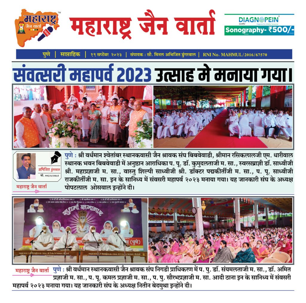 ← Back to Homepage १९ सप्टेंबर २०२३ – सवंत्सरी महापर्व २०२३ उत्साह मे मनाया गया ।। maharashtrajainwarta • Maharashtra Jain Warta, MJW Daily News(Post Slider) • September 19, 2023 📥 Download News PDF