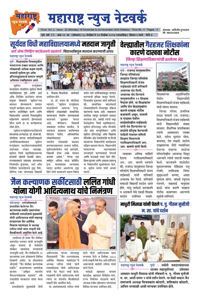 ← Back to Homepage 18 Nov to 24 Nov 2024 Weekly Isuue maharashtra jain warta • Maharashtra News Networks, MNN - Weekly Issue • November 23, 2024 📥 Download News PDF Spread the love