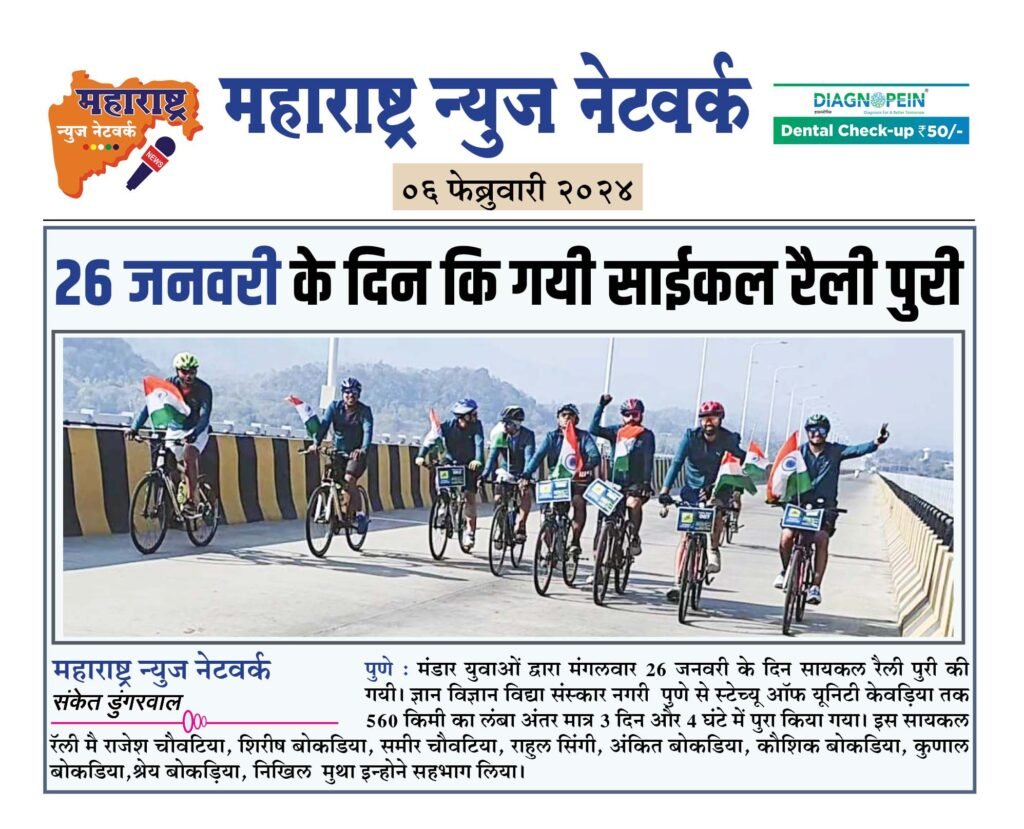 पुणे : मंडार युवाओं द्वारा मंगलवार 26 जनवरी के दिन सायकल रैली पुरी की गयी। ज्ञान विज्ञान विद्या संस्कार नगरी पुणे से स्टेच्यू ऑफ यूनिटी केवड़िया तक 560 किमी का लंबा अंतर मात्र 3 दिन और 4 घंटे में पुरा किया गया। इस सायकल रॅली मै राजेश चौवटिया, शिरीष बोकडिया, समीर चौवटिया, राहुल सिंगी, अंकित बोकडिया, कौशिक बोकडिया, कुणाल बोकडिया,श्रेय बोकड़िया, निखिल मुथा इन्होने सहभाग लिया।