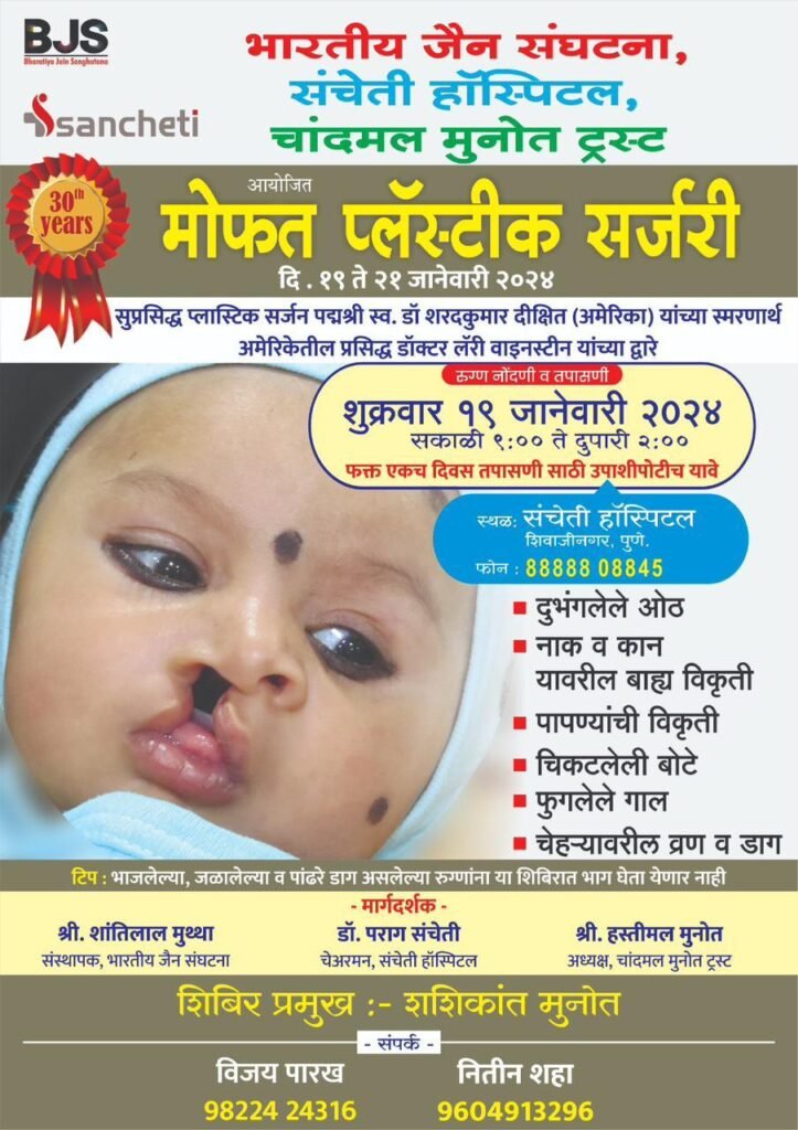 पुणे : भारतीय जैन संघटना, संचेती हॉस्पिटल, पुणे व चांदमल मुनोत ट्रस्ट यांचे संयुक्त विद्यमाने ३० वे मोफत प्लॅस्टिक सर्जरी शिबीर दिनांक १९ जानेवारी २०२४ रोजी संचेती हॉस्पिटल, शिवाजीनगर, पुणे येथे आयोजित करण्यात आले असल्याचे भारतीय जैन संघटनेचे संस्थापक शांतिलाल मुथ्था, संचेती हॉस्पिटलचे चेअरमन डॉ. पराग संचेती व चांदमल मुनोत ट्रस्ट यांचे अध्यक्ष हस्तीमलजी मुनोत यांनी कळविले आहे.